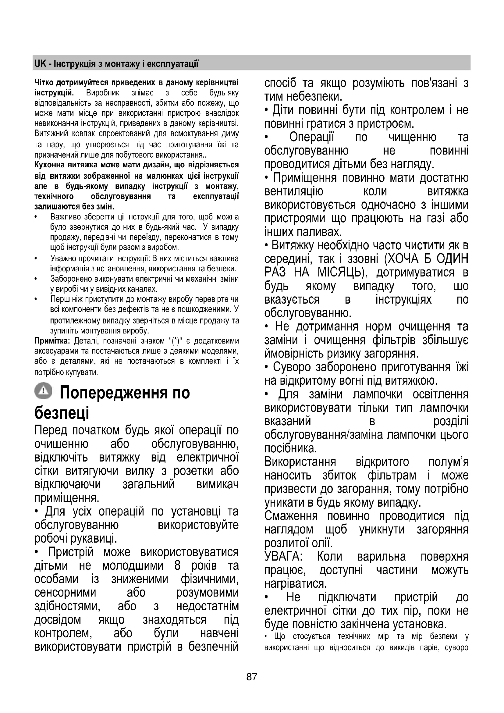 - Приміщення повинно мати достатню вентиляцію коли витяжка використовується одночасно з іншими пристроями що працюють на газі або інших паливах.