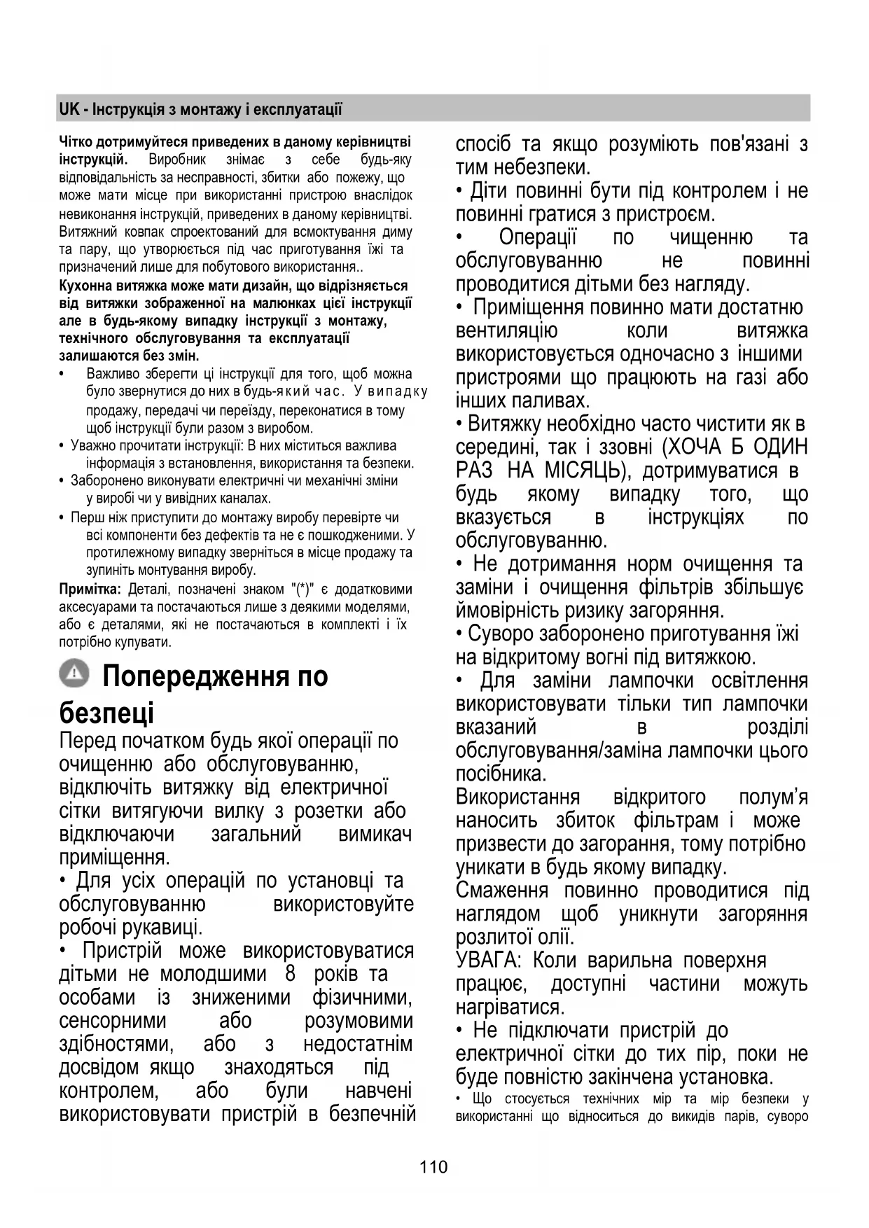 - Витяжка НІКОЛИ не повинна використовуватися як опорна поверхня, якщо тільки не вказується.