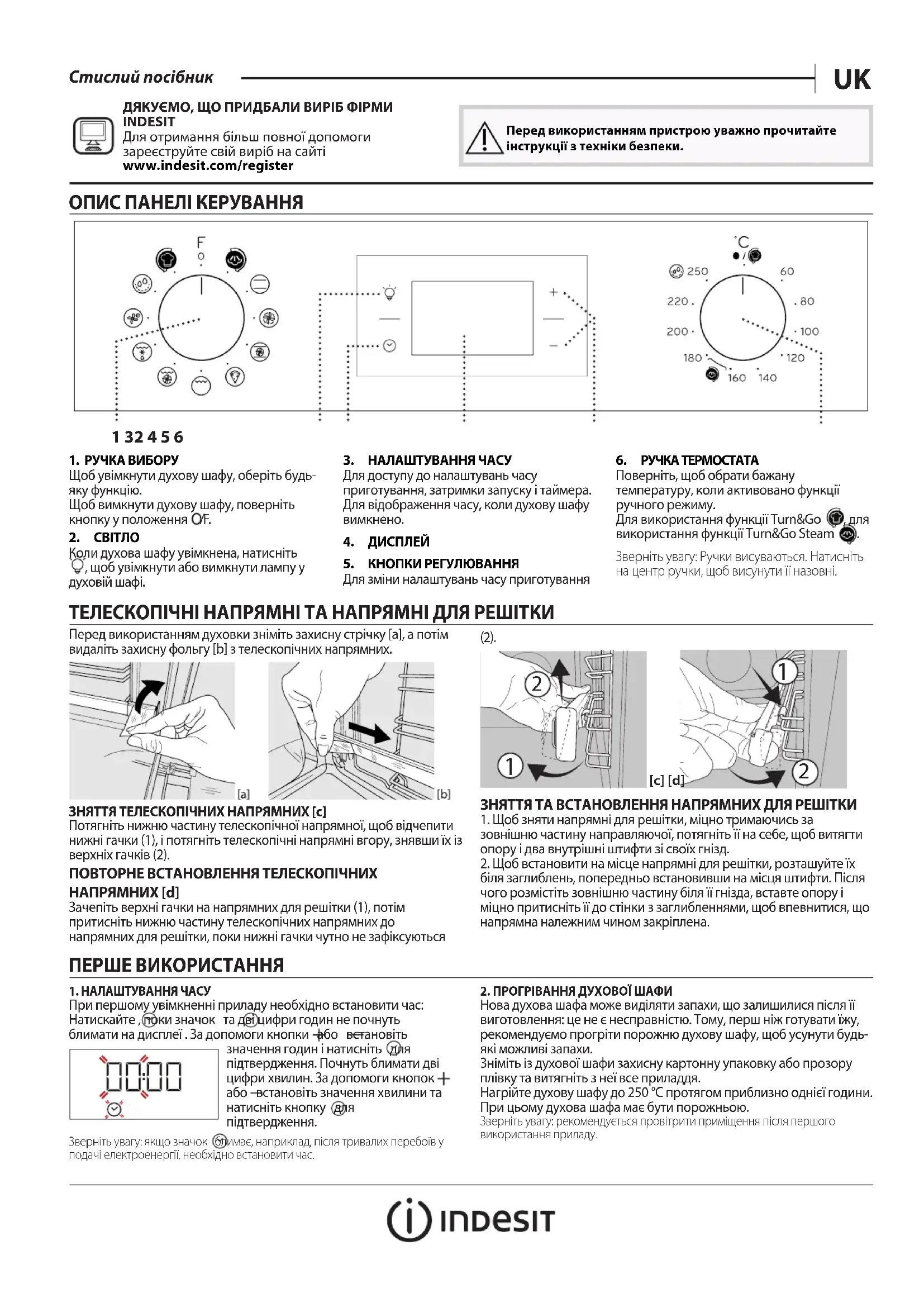 [c] [d]ЗНЯТТЯ ТА ВСТАНОВЛЕННЯ НАПРЯМНИХ ДЛЯ РЕШІТКИ1. Щоб зняти напрямні для решітки, міцно тримаючись за зовнішню частину направляючої, потягніть її на себе, щоб витягти опору і два внутрішні штифти зі своїх гнізд.2. Щоб встановити на місце напрямні для решітки, розташуйте їх біля заглиблень, попередньо встановивши на місця штифти. Після чого розмістіть зовнішню частину біля її гнізда, вставте опору і міцно притисніть її до стінки з заглибленнями, щоб впевнитися, що напрямна належним чином закріплена.ПЕРШЕ ВИКОРИСТАННЯ1. НАЛАШТУВАННЯ ЧАСУПри першому увімкненні приладу необхідно встановити час: Натискайте , поки значок та дві цифри годин не почнуть блимати на дисплеї . За допомоги кнопки або встановіть значення годин і натисніть для підтвердження. Почнуть блимати дві цифри хвилин. За допомоги кнопок або встановіть значення хвилини та натисніть кнопку для підтвердження.Зверніть увагу: якщо значок блимає, наприклад, після тривалих перебоїв у подачі електроенергії, необхідно встановити час.2. ПРОГРІВАННЯ ДУХОВОЇ ШАФИНова духова шафа може виділяти запахи, що залишилися після її виготовлення: це не є несправністю. Тому, перш ніж готувати їжу, рекомендуємо прогріти порожню духову шафу, щоб усунути будь-які можливі запахи.Зніміть із духової шафи захисну картонну упаковку або прозору плівку та витягніть з неї все приладдя.Нагрійте духову шафу до 250 °C протягом приблизно однієї години. При цьому духова шафа має бути порожньою.Зверніть увагу: рекомендується провітрити приміщення після першого використання приладу.ОПИС ПАНЕЛІ КЕРУВАННЯ1 32 4 5 61. РУЧКА ВИБОРУЩоб увімкнути духову шафу, оберіть будь-яку функцію.Щоб вимкнути духову шафу, поверніть кнопку у положення /F.2. СВІТЛОКоли духова шафу увімкнена, натисніть , щоб увімкнути або вимкнути лампу у духовій шафі.3. НАЛАШТУВАННЯ ЧАСУДля доступу до налаштувань часу приготування, затримки запуску і таймера.Для відображення часу, коли духову шафу вимкнено.4. ДИСПЛЕЙ5. КНОПКИ РЕГУЛЮВАННЯДля зміни налаштувань часу приготування6. РУЧКА ТЕРМОСТАТАПоверніть, щоб обрати бажану температуру, коли активовано функції ручного режиму. Для використання функції Turn&Go , для використання функції Turn&Go Steam .Зверніть увагу: Ручки висуваються. Натисніть на центр ручки, щоб висунути її назовні.ДЯКУЄМО, ЩО ПРИДБАЛИ ВИРІБ ФІРМИ INDESITДля отримання більш повної допомоги зареєструйте свій виріб на сайті www . indesit . com / register Перед використанням пристрою уважно прочитайте інструкції з техніки безпеки.400011519049