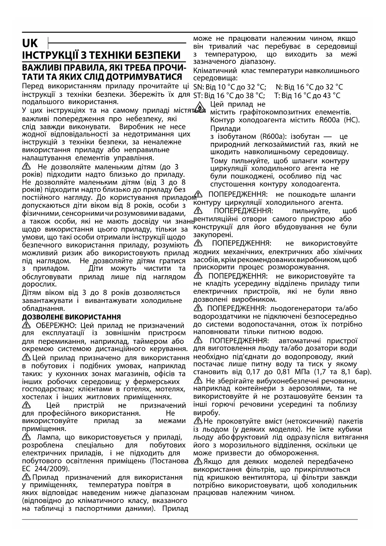 Дітям віком від 3 до 8 років дозволяється завантажувати і вивантажувати холодильне обладнання. ДОЗВОЛЕНЕ ВИКОРИСТАННЯ ОБЕРЕЖНО: Цей прилад не призначений для експлуатації із зовнішнім пристроєм для перемикання, наприклад, таймером або окремою системою дистанційного керування. Цей прилад призначено для використання в побутових і подібних умовах, наприклад таких: у кухонних зонах магазинів, офісів та інших робочих середовищ; у фермерських господарствах; клієнтами в готелях, мотелях, хостелах і інших житлових приміщеннях. Цей пристрій не призначений для професійного використання. Не використовуйте прилад за межами приміщення. Лампа, що використовується у приладі, розроблена спеціально для побутових електричних приладів, і не підходить для побутового освітлення приміщень (Постанова EC 244/2009). Прилад призначений для використання у приміщеннях, температура повітря в яких відповідає наведеним нижче діапазонам (відповідно до кліматичного класу, вказаного на табличці з паспортними даними). Прилад може не працювати належним чином, якщо він тривалий час перебуває в середовищі з температурою, що виходить за межі зазначеного діапазону. Кліматичний клас температури навколишнього середовища: SN: Від 10 °C до 32 °C; N: Від 16 °C до 32 °C ST: Від 16 °C до 38 °C; T: Від 16 °C до 43 °C Цей прилад не містить графітокомпозитних елементів. Контур холодоагента містить R600a (HC).