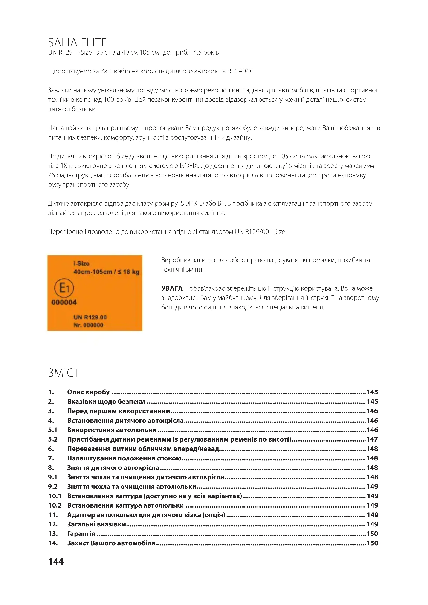 Upozorňujeme na to, že pri používaní detských autosedačiek nie je možné vylúčiť poškodenie sedadiel vozidla. Bezpečnostná smernica ECE R129.00 vyžaduje pevnú montáž autosedačky. Pri sedadlách vášho vozidla vykonajte vhodné ochranné opatrenia (napr. RECARO Car Seat Protector). Firma RECARO Kids s.r.l. alebo jej predajcovia neručia za prípadné poškodenia sedadiel vozidla.144 SALIA ELITE UN R129 · i-Size · зріст від 40см 105см · до прибл. 4,5 років Щиро дякуємо за Ваш вибір на користь дитячого автокрісла RECARO! Завдяки нашому унікальному досвіду ми створюємо революційні сидіння для автомобілів, літаків та спортивної техніки вже понад 100 років. Цей позаконкурентний досвід віддзеркалюється у кожній деталі наших систем дитячої безпеки. Наша найвища ціль при цьому – пропонувати Вам продукцію, яка буде завжди випереджати Ваші побажання – в питаннях безпеки, комфорту, зручності в обслуговуванні чи дизайну. Це дитяче автокрісло i-Size дозволене до використання для дітей зростом до 105см та максимальною вагою тіла 18кг, виключно з кріпленням системою ISOFIX. До досягнення дитиною віку15місяців та зросту максимум 76см, інструкціями передбачається встановлення дитячого автокрісла в положенні лицем проти напрямку руху транспортного засобу. Дитяче автокрісло відповідає класу розміру ISOFIX D або B1. З посібника з експлуатації транспортного засобу дізнайтесь про дозволені для такого використання сидіння. Перевірено і дозволено до використання згідно зі стандартом UN R129/00 i-Size. Виробник залишає за собою право на друкарські помилки, похибки та технічні зміни. УВАГА – обов’язково збережіть цю інструкцію користувача. Вона може знадобитись Вам у майбутньому. Для зберігання інструкції на зворотному боці дитячого сидіння знаходиться спеціальна кишеня.