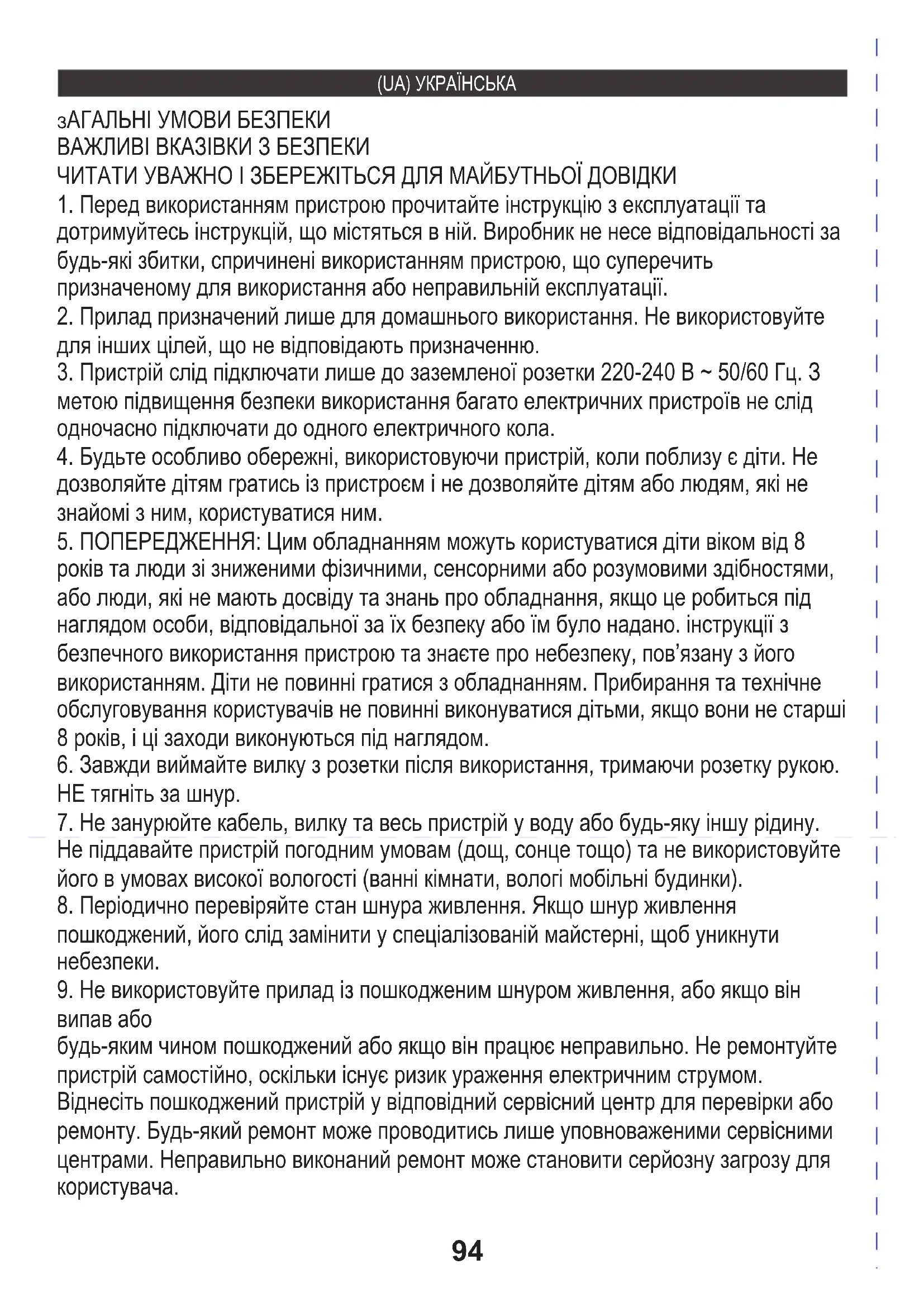 років та люди зі зниженими фізичними, сенсорними або розумовими здібностями, або люди, які не мають досвіду та знань про обладнання, якщо це робиться під наглядом особи, відповідальної за їх безпеку або їм було надано. інструкції з безпечного використання пристрою та знаєте про небезпеку, пов’язану з його використанням. Діти не повинні гратися з обладнанням. Прибирання та технічне обслуговування користувачів не повинні виконуватися дітьми, якщо вони не старші 8 років, і ці заходи виконуються під наглядом. ЧИТАТИ УВАЖНО І ЗБЕРЕЖІТЬСЯ ДЛЯ МАЙБУТНЬОЇ ДОВІДКИ