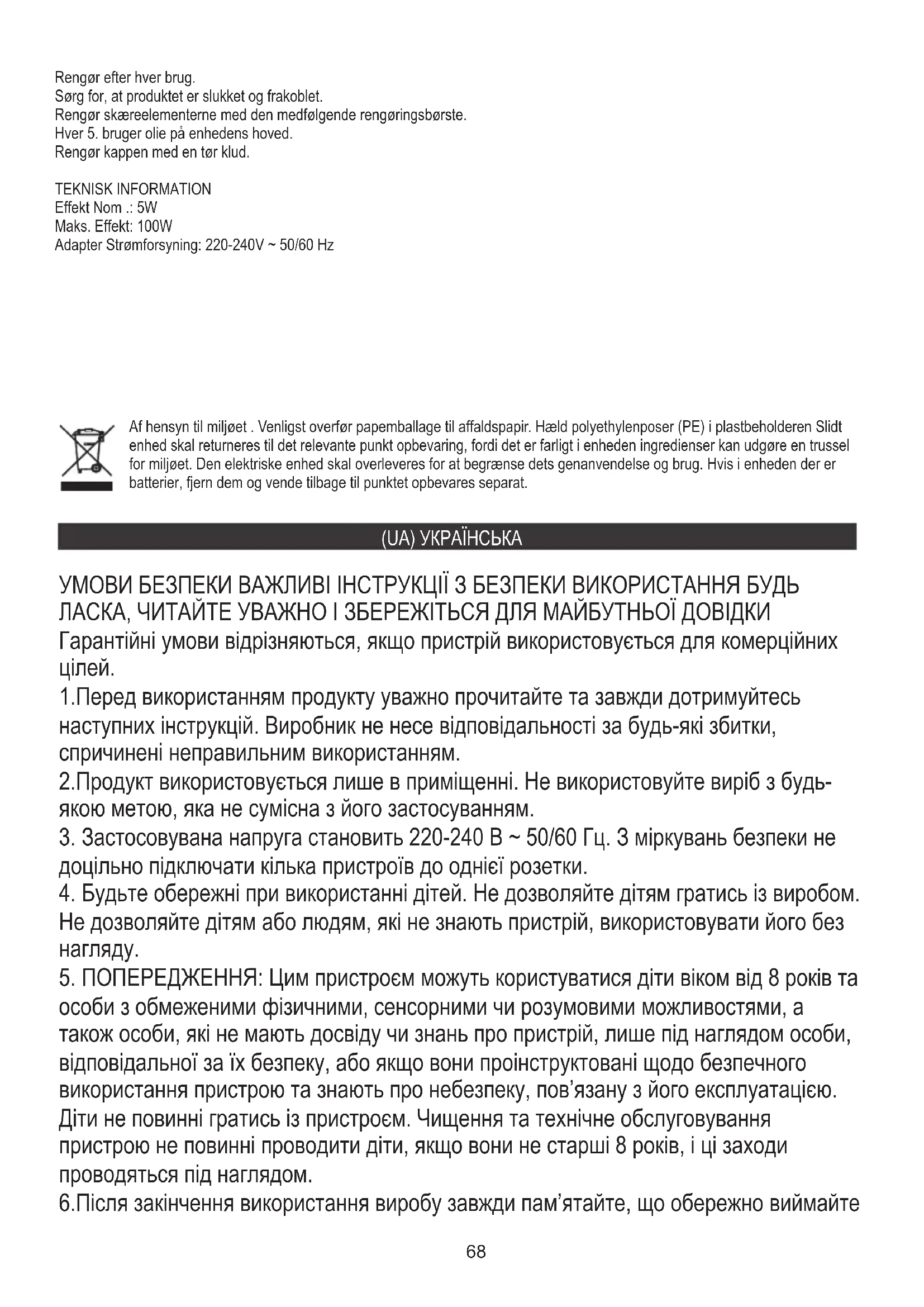 особи з обмеженими фізичними, сенсорними чи розумовими можливостями, а також особи, які не мають досвіду чи знань про пристрій, лише під наглядом особи, відповідальної за їх безпеку, або якщо вони проінструктовані щодо безпечного використання пристрою та знають про небезпеку, пов’язану з його експлуатацією. Діти не повинні гратись із пристроєм. Чищення та технічне обслуговування пристрою не повинні проводити діти, якщо вони не старші 8 років, і ці заходи проводяться під наглядом. 6.Після закінчення використання виробу завжди пам’ятайте, що обережно виймайте (UA) УКРАЇНСЬКА69 вилку з розетки, тримаючи розетку рукою. Ніколи не тягніть за силовий кабель !!!
