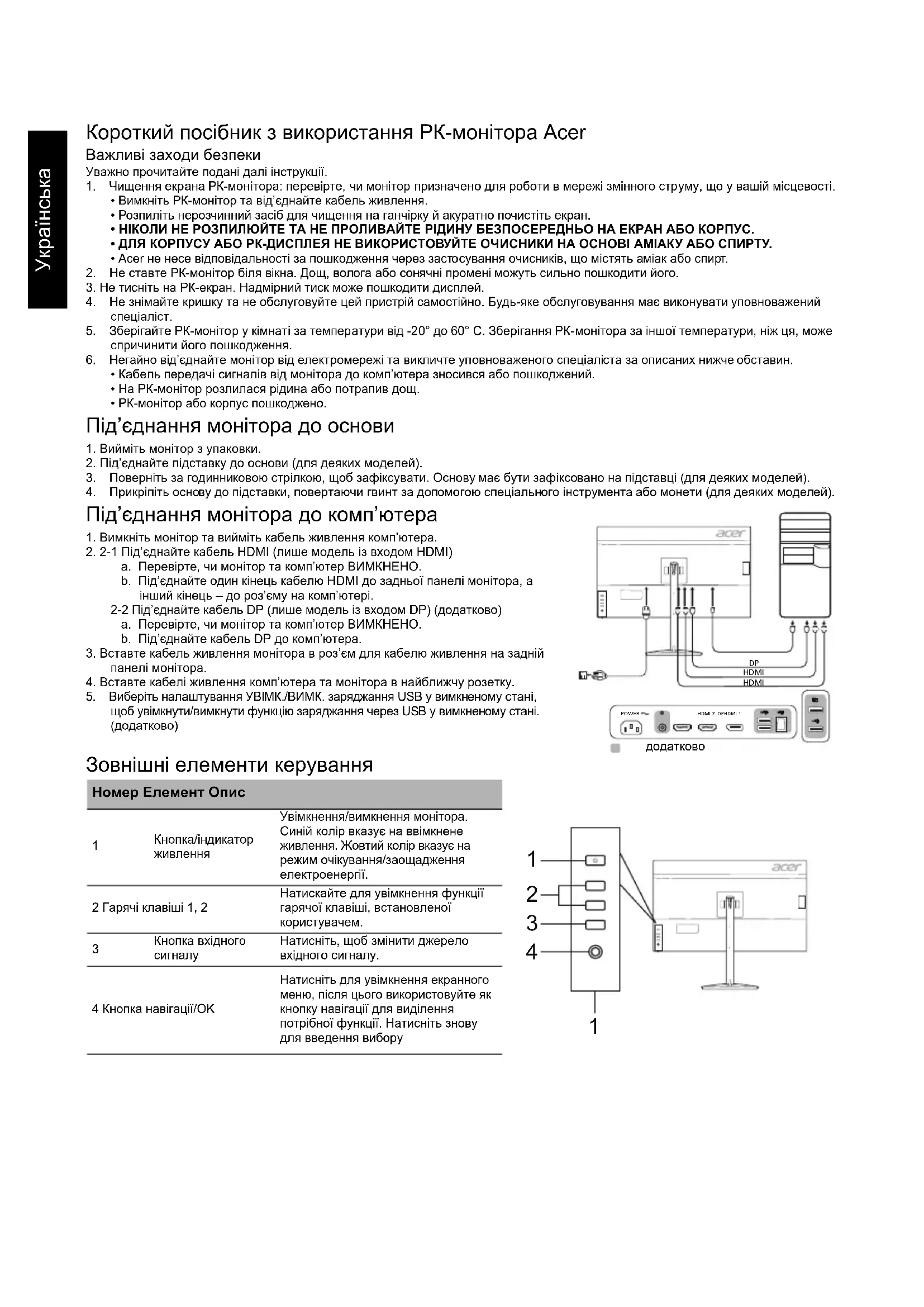 4Українська Правові норми та заходи безпеки Повідомлення Федеральної комісії зв’язку Цей пристрій пройшов перевірку та відповідає обмеженням для цифрових пристроїв класу В, як передбачено частиною 15 Правил Федеральної комісії зв’язку. Ці обмеження призначено для забезпечення належного захисту від шкідливих перешкод у житловому середовищі. Цей пристрій створює, використовує та може випромінювати радіочастотну енергію, а тому, у разі встановлення та використання із порушенням інструкцій, може призводити до виникнення шкідливих перешкод для радіозв’язку Проте немає жодної гарантії, що у певному варіанті встановлення перешкоди не виникатимуть. Якщо цей пристрій створює перешкоди для прийому радіосигналу або телевізійного сигналу, що можна перевірити шляхом вимикання та вмикання пристрою, рекомендується спробувати усунути перешкоди одним із наведених способів. Налаштуйте або змініть розташування прийомної антени. Збільшіть відстань між пристроєм і приймачем. Під’єднайте пристрій та приймач до різних розеток. Зверніться за допомогою до дилера або досвідченого телерадіотехніка. Заява про відповідність ЄС Цим повідомленням компанія Acer Inc. стверджує, що цей РК-монітор відповідає важливим вимогам та іншим відповідним умовам Директиви щодо електромагнітної сумісності 2014/30/EU, Директиви щодо низької напруги 2014/35/EU, Директиви про обмеження вмісту шкідливих речовин 2011/65/EU та Директиви 2009/125/EC щодо визначення норм для встановлення вимог стосовно екодизайну для виробу, пов’язаного з енергією.