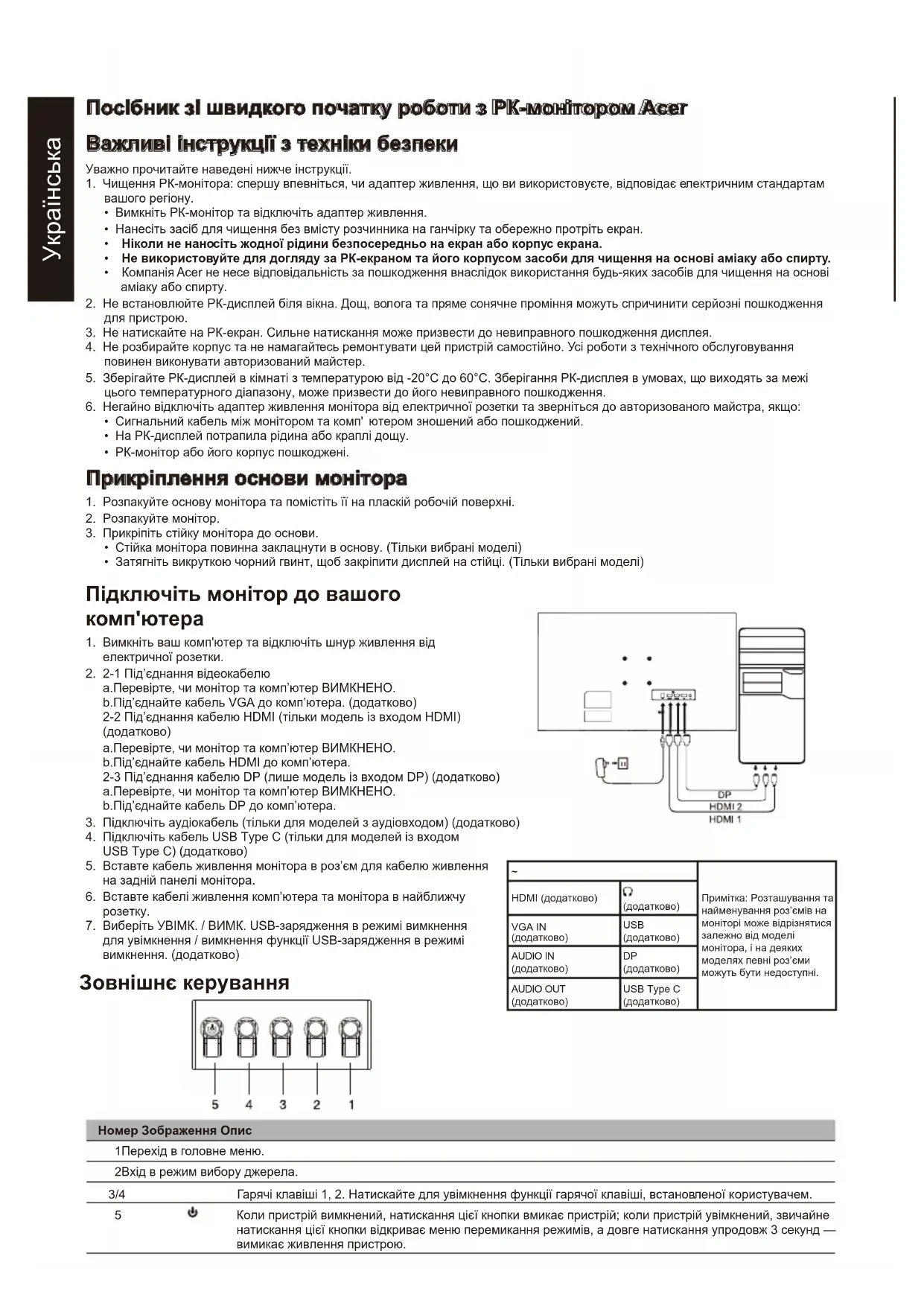 Будь-які зміни або модифікації, що не були явно схвалені виробником, можуть призвести до втрати користувачем права використовувати цей пристрій. Умови використання Цей пристрій відповідає вимогам частини 15 правил FCC. Експлуатація можлива за виконання таких двох умов: (1) цей пристрій не повинен створювати шкідливі радіоперешкоди та (2) цей пристрій повинен приймати будь-які перешкоди, включно з перешкодами, що можуть спричиняти небажані операції. Примітка: Користувачам у Канаді Цей цифровий пристрій Класу В відповідає канадським характеристикам ICES-003. Remarque à I'intention des utilisateurs canadiens Cet appareil numrique de la classe B est conforme à la norme NMB-003 du Canada Пояснювальна примітка до «Вимог щодо належної переробки та утилізації використаного електричного та електронного обладнання». З метою плекання та захисту нашої планети, коли у вашого пристрою вичерпається термін експлуатації або він не буде вам більше потрібен, будь ласка, дотримуйтесь національного законодавства та приписів щодо переробки електричних та електронних пристроїв та переробляйте їх у місцевих виробників, що мають для цього відповідні засоби. Утилізація використаного обладнання користувачами з ЄС Цей значок на виробі або на упакуванні вказує, що цей виріб забороняється утилізувати разом з іншим побутовим сміттям. Під час утилізації використаних пристроїв ви повинні принести на збірний пункт, що займається переробкою використаного електричного та електронного обладнання. Роздільний збір та утилізація використаних пристроїв допомагає зберегти природні ресурси та дозволяє переробити їх у безпечний для здоров'я людей та довкілля спосіб. За детальною інформацією щодо пунктів збору та переробки використаних виробів звертайтесь у ваше місцеве муніципальне управління, в службу з утилізації побутових відходів або в магазин, де був придбаний даний виріб. Декларація щодо відповідності нормативам ЄС Цим компанія Acer заявляє, що цей РК-монітор відповідає основним вимогам та іншим відповідним положенням Директиви з електромагнітної сумісності 2014/30/EU, Директиви з низьковольтного електрообладнання 2014/35/EU, Директиви RoHS 2011/65/EU з обмеження використання деяких небезпечних речовин та Директиви 2009/125/EC з метою створення основи для встановлення вимог до екодизайну продукції, що використовує електроенергію. Монітор Acer призначений для відображення відео та візуальної інформації з електронних пристроїв.Українська ТЕХНІЧНІ ХАРАКТЕРИСТИКИ