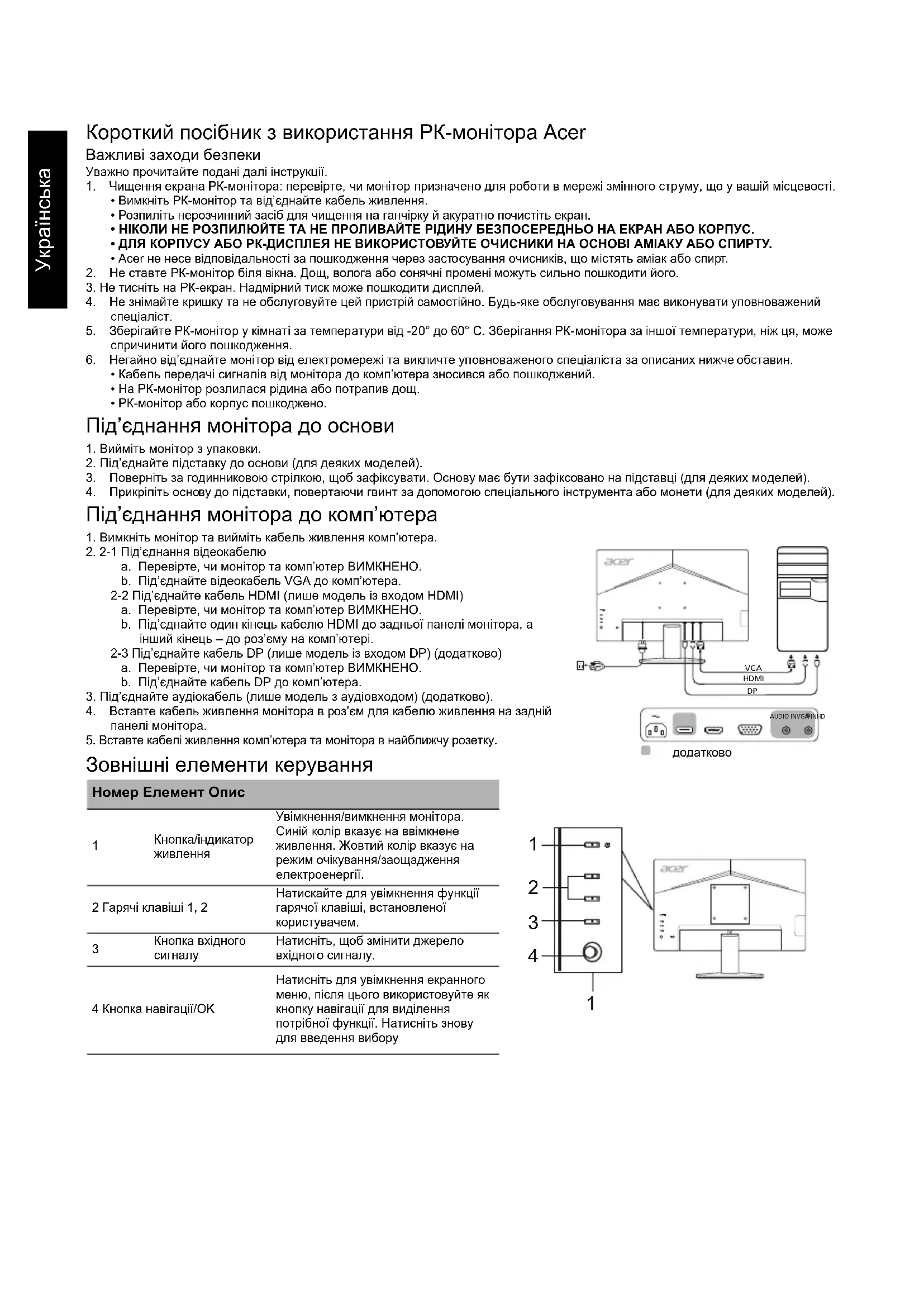 (típico) Contraste máx. de 100.000.000:1 (ACM) Ângulo de visualização 178° (H) e 178° (V) (CR = 10) Tempo de resposta 1 ms (VRB) Vídeo Interface analógica R, G, B Tipo de painel In-Plane Switching Frequência H 30 - 85 kHz Frequência V 56 - 76 Hz Cores do visor 16,7 Milhões Frequência de pontos 174,5 MHz Resolução máxima VGA: 1920 x 1080 a 60 Hz HDMI/DP: 1920 x 1080 a 75 Hz Plug&Play VESA DDCCI/DDC2B Classe de eficiência energética A+ *Consumo de energia anual 31 kWh (modelo com entrada HDMI) Consumo de energia (até 200 nits) Ligado 20 W (típico) Hibernação 0,5 W (típico) Desligado 0,5 W (típico) Conector de entrada D-Sub HDMI (somente nos modelos com entrada HDMI) DP (somente nos modelos com entrada DP) (opcional) Sinal de entrada de vídeo Analógico: 0,7 Vp-p (padrão), 75 OHM, Positivo HDMI (somente nos modelos com entrada HDMI) (opcional) DP (somente nos modelos com entrada DP) (opcional) Alto-falantes 2 W x 2 (somente nos modelos com entrada de áudio — opcional) Tamanho máximo da tela Horizontal: 597,88 mm Vertical: 336,31 mm Fonte de alimentação 100-240 V, 50/60 Hz Condições do ambiente Temperatura de funcionamento: de 0 a 40 °C Temperatura de armazenamento: de -20 a 60 °C Umidade operacional: de 20 a 80% Dimensões 612,3 (L) × 453,02 (A) × 200,05 (P) mm Peso (líquido) 5,38 kg (líquido) Especificações do mecanismo Inclinação: de -5 a +15° Rotação: Não Ajuste de altura: Não Giro: Não Suporte separável: Sim Controles externos Botões Botão ON/OFF Atalho 1 Atalho 2 Entrada Menu/Navi/OK Funções Brilho Contraste Luz azul Aumento de Preto ACM Super Nitidez Posição-H (somente nos modelos com entrada analógica) Posição-V (somente nos modelos com entrada analógica) Sincronismo (somente nos modelos com entrada analógica) Foco (somente nos modelos com entrada analógica) Ajuste Automático (somente nos modelos com entrada analógica) Gamma Temp. de cor Modos Modo sRGB Modo Esc.Cinza Matiz 6-eixos Satur.6-eixos Volume Mudo Over Drive FreeSync Num taxa atualiz VRB Idioma Tempo limite OSD Transparência Bloqueio OSD Entrada Fonte automática Designação de Atalho Wide Mode DDC/CI Nível preto HDMI Modo Início Ráp. Informações sobre o visor Redefinir Todas Config Saír As especificações podem variar dependendo do modelo e/ou da região.Українська Короткий посібник з використання РК-монітора Acer Важливі заходи безпеки Уважно прочитайте подані далі інструкції. 1. Чищення екрана РК-монітора: перевірте, чи монітор призначено для роботи в мережі змінного струму, що у вашій місцевості.