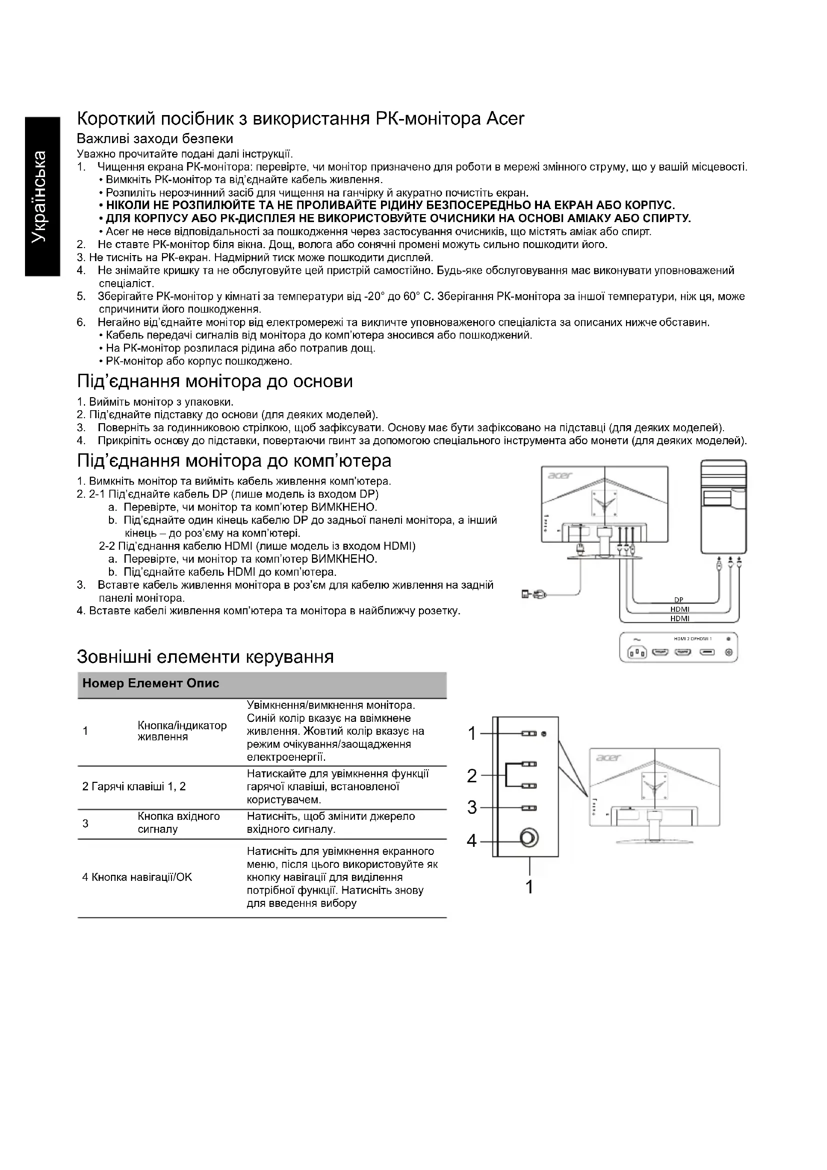 Кнопка/індикатор живленняУвімкнення/вимкнення монітора. Синій колір вказує на ввімкнене живлення. Жовтий колір вказує на режим очікування/заощадження електроенергії.2 Гарячі клавіші 1, 2Натискайте для увімкнення функції гарячої клавіші, встановленої користувачем. Кнопка вхідного сигналуНатисніть, щоб змінити джерело вхідного сигналу. 4 Кнопка навігації/OKНатисніть для увімкнення екранного меню, після цього використовуйте як кнопку навігації для виділення потрібної функції. Натисніть знову для введення вибору HDMI HDMI
