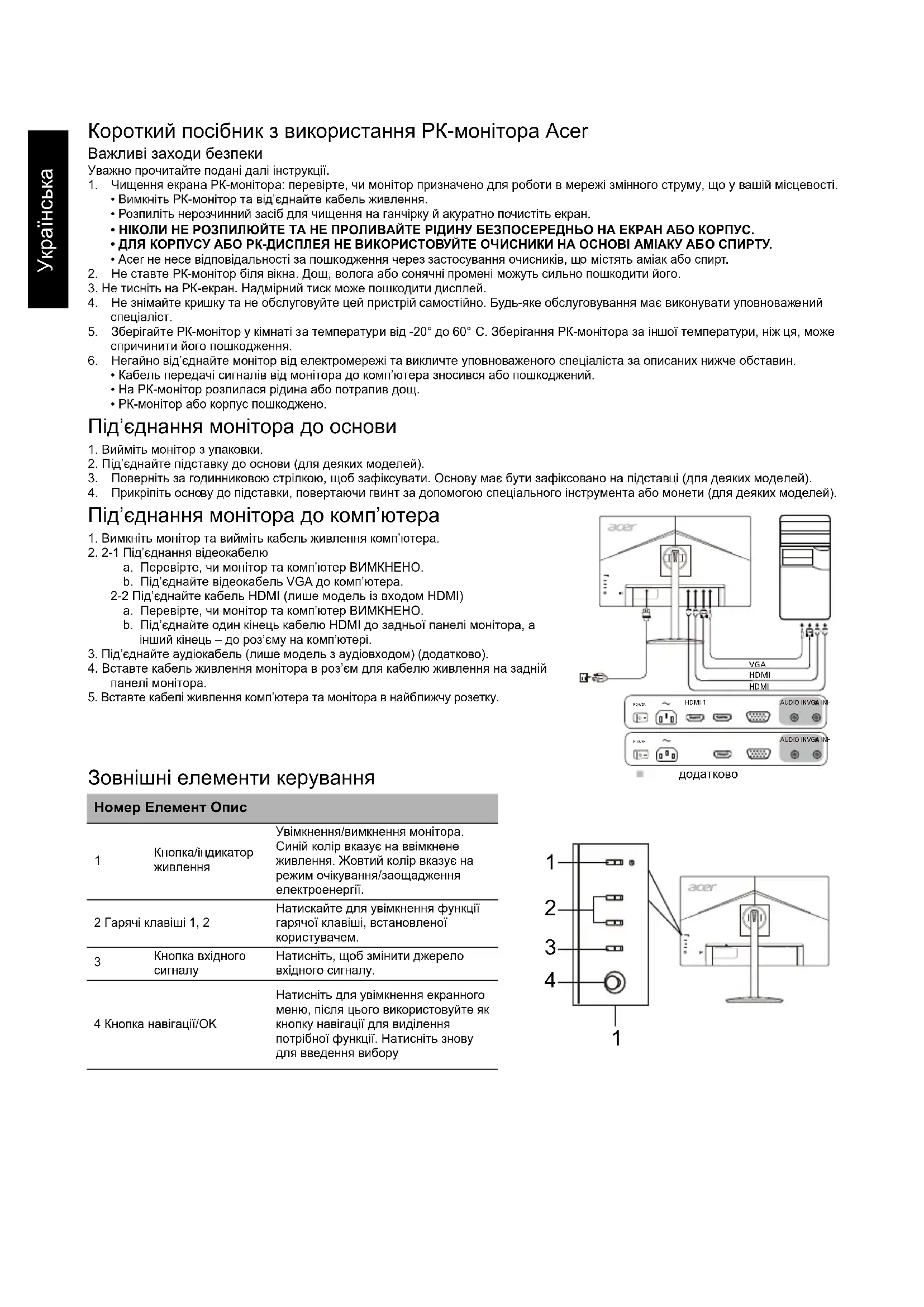 4. Прикріпіть основу до підставки, повертаючи гвинт за допомогою спеціального інструмента або монети (для деяких моделей). Під’єднання монітора до комп’ютера 1. Вимкніть монітор та вийміть кабель живлення комп’ютера.2. 2-1 Під’єднання відеокабелюa. Перевірте, чи монітор та комп’ютер ВИМКНЕНО.b. Під’єднайте відеокабель VGA до комп’ютера. 2-2 Під’єднайте кабель HDMI (лише модель із входом HDMI)a. Перевірте, чи монітор та комп’ютер ВИМКНЕНО.b. Під’єднайте один кінець кабелю HDMI до задньої панелі монітора, а інший кінець – до роз’єму на комп’ютері.3. Під’єднайте аудіокабель (лише модель з аудіовходом) (додатково).4. Вставте кабель живлення монітора в роз’єм для кабелю живлення на задній панелі монітора.5. Вставте кабелі живлення комп’ютера та монітора в найближчу розетку. Зовнішні елементи керування Номер Елемент Опис