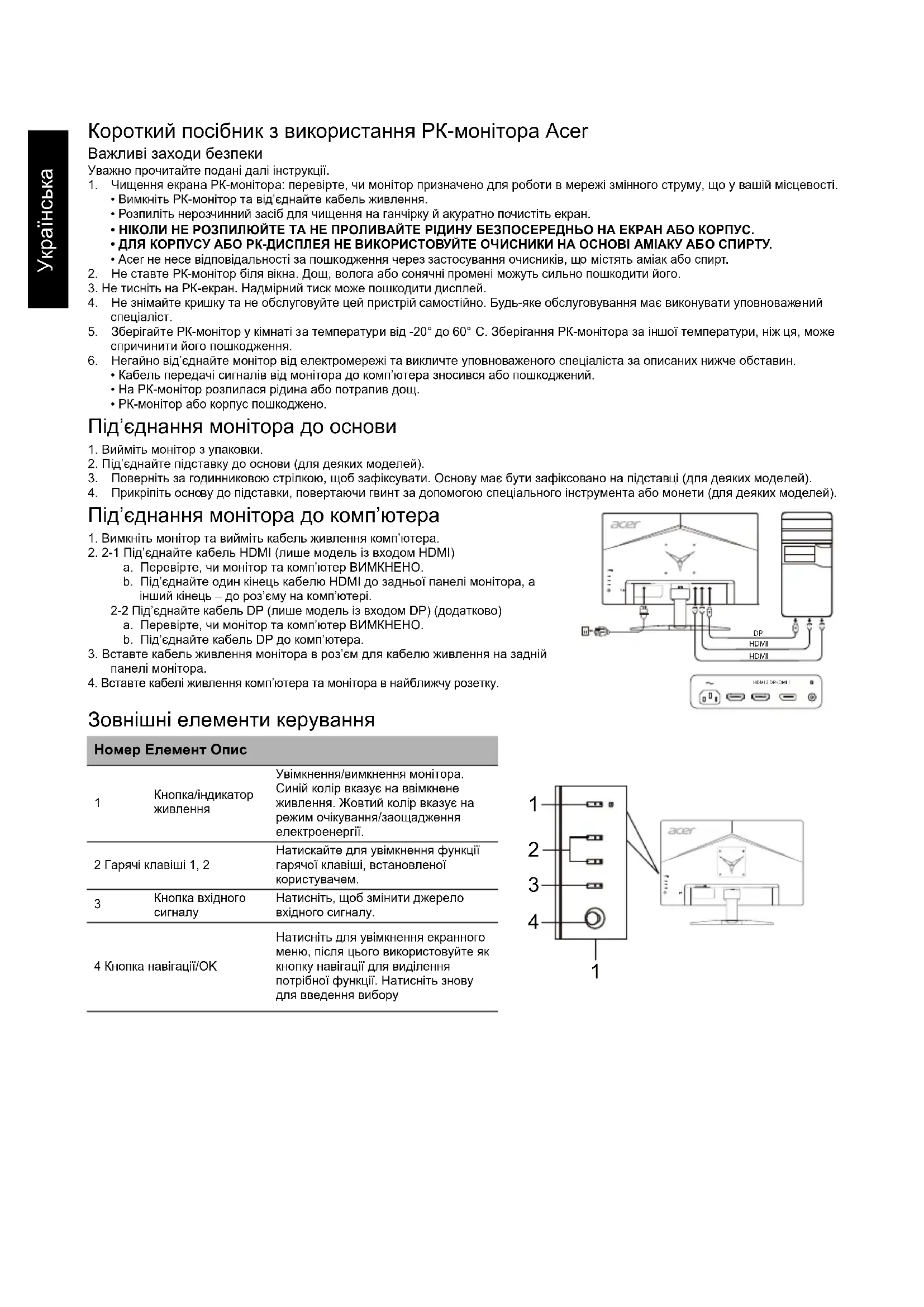 4. Прикріпіть основу до підставки, повертаючи гвинт за допомогою спеціального інструмента або монети (для деяких моделей). Під’єднання монітора до комп’ютера 1. Вимкніть монітор та вийміть кабель живлення комп’ютера.2. 2-1 Під’єднайте кабель HDMI (лише модель із входом HDMI)a. Перевірте, чи монітор та комп’ютер ВИМКНЕНО.b. Під’єднайте один кінець кабелю HDMI до задньої панелі монітора, а інший кінець – до роз’єму на комп’ютері.2-2 Під’єднайте кабель DP (лише модель із входом DP) (додатково)a. Перевірте, чи монітор та комп’ютер ВИМКНЕНО.b. Під’єднайте кабель DP до комп’ютера.3. Вставте кабель живлення монітора в роз’єм для кабелю живлення на задній панелі монітора.4. Вставте кабелі живлення комп’ютера та монітора в найближчу розетку. Зовнішні елементи керування Номер Елемент Опис