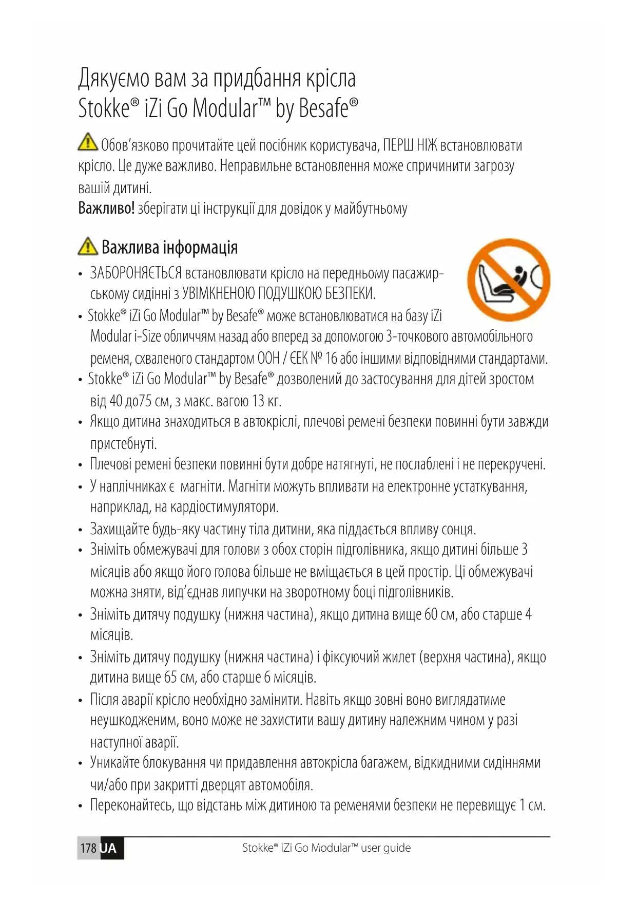 - Garantinin geçersiz hale gelmesi için: faturanın bulunmaması, yanlış ya da uygun olma- yan kullanımın kusurlara yol açması, suiistimal, hatalı kullanım ya da ihmalin kusurlara yol açması.Stokke® iZi Go Modular™ user guide 178 UA Дякуємо вам за придбання крісла Stokke® iZi Go Modular™ by Besafe® Обов’язково прочитайте цей посібник користувача, ПЕРШ НІЖ встановлювати крісло. Це дуже важливо. Неправильне встановлення може спричинити загрозу вашій дитині. Важливо! зберігати ці інструкції для довідок у майбутньому Важлива інформація