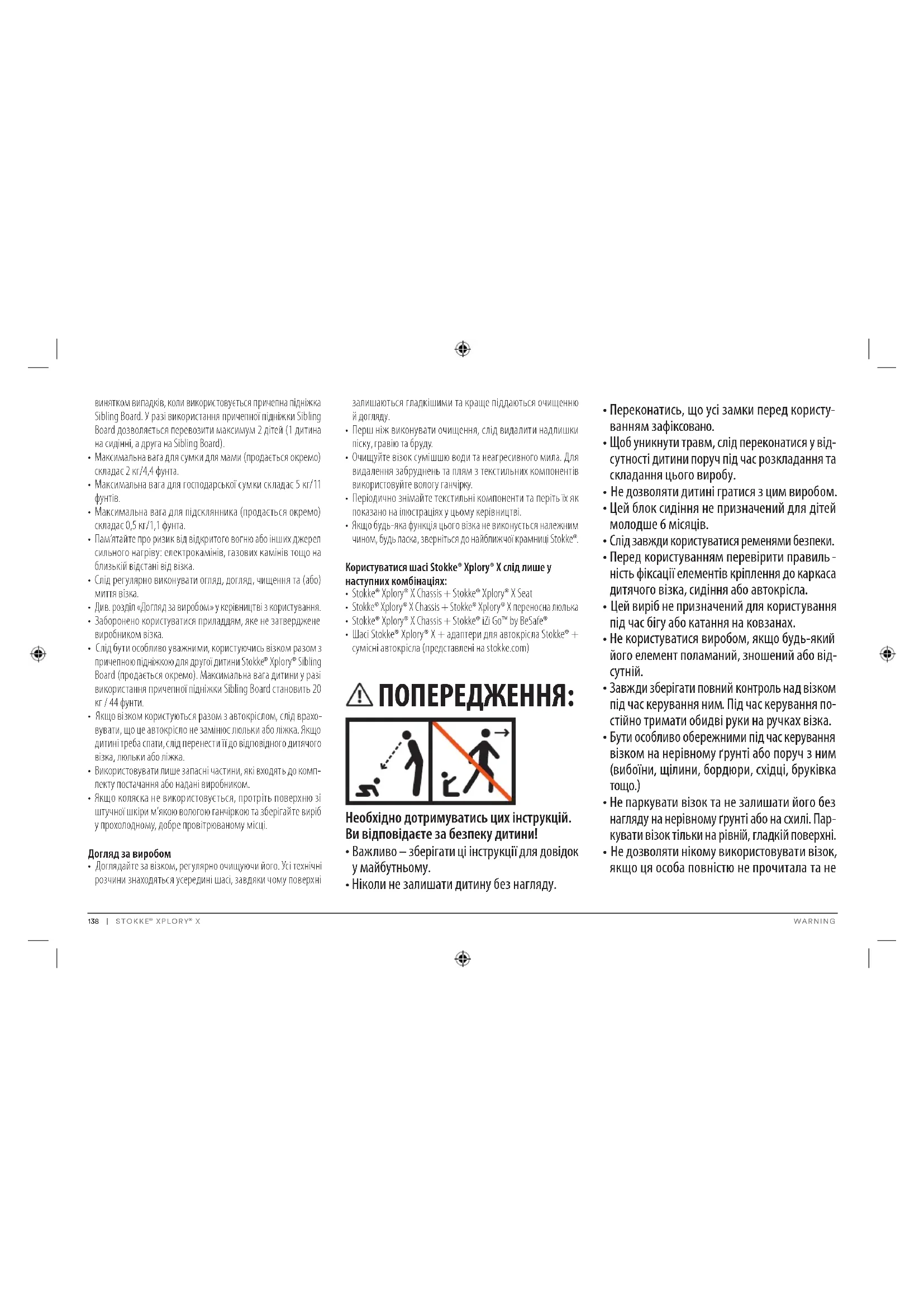 - Слід бути особливо уважними, користуючись візком разом з причепною підніжкою для другої дитини Stokke® Xplory® Sibling Board (продається окремо). Максимальна вага дитини у разі використання причепної підніжки Sibling Board становить 20 кг / 44 фунти.