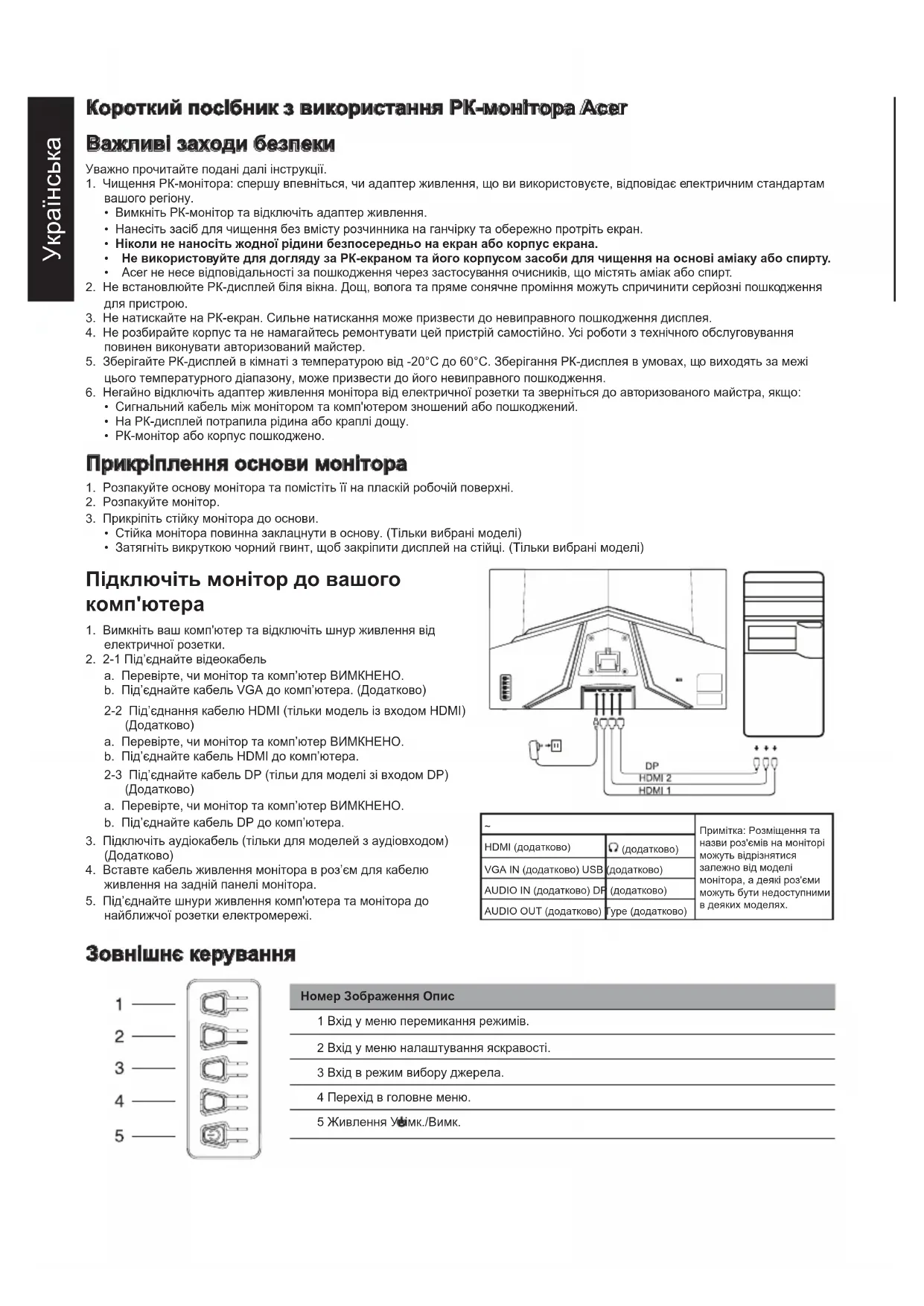 Примітка: Розміщення та назви роз'ємів на моніторі можуть відрізнятися залежно від моделі монітора, а деякі роз'єми можуть бути недоступними в деяких моделях. HDMI (додатково) (додатково) VGA IN (додатково) USB (додатково) AUDIO IN (додатково) DP (додатково) AUDIO OUT (додатково) Type (додатково) Зовнішнє керування Номер Зображення Опис 1 Вхід у меню перемикання режимів. 2 Вхід у меню налаштування яскравості. 3 Вхід в режим вибору джерела. 4 Перехід в головне меню. 5 Живлення Увімк./Вимк.Українська Регулятивні заяви та заяви щодо безпеки Заява FCC Даний пристрій перевірений та визнаний таким, що відповідає обмеженням для цифрових пристроїв класу В, відповідно до Частини 15 Правил FCC. Ці обмеження розроблені з метою забезпечення розумного захисту від шкідливого випромінювання пристрою, якщо він встановлюється в житловій зоні. Цей виріб генерує, використовує та може випромінювати електромагнітні хвилі. Якщо таке обладнання не встановлювати та не використовувати згідно з інструкціями, воно може створювати перешкоди для радіозв’язку. Однак немає гарантії, що такі перешкоди не виникнуть при правильному встановленні. Якщо цей пристрій спричинює перешкоди для радіо- або телепередач (що можна встановити увімкнення та вимкненням цього пристрою), тоді для усунення перешкод рекомендуємо користувачам використати один із таких засобів: