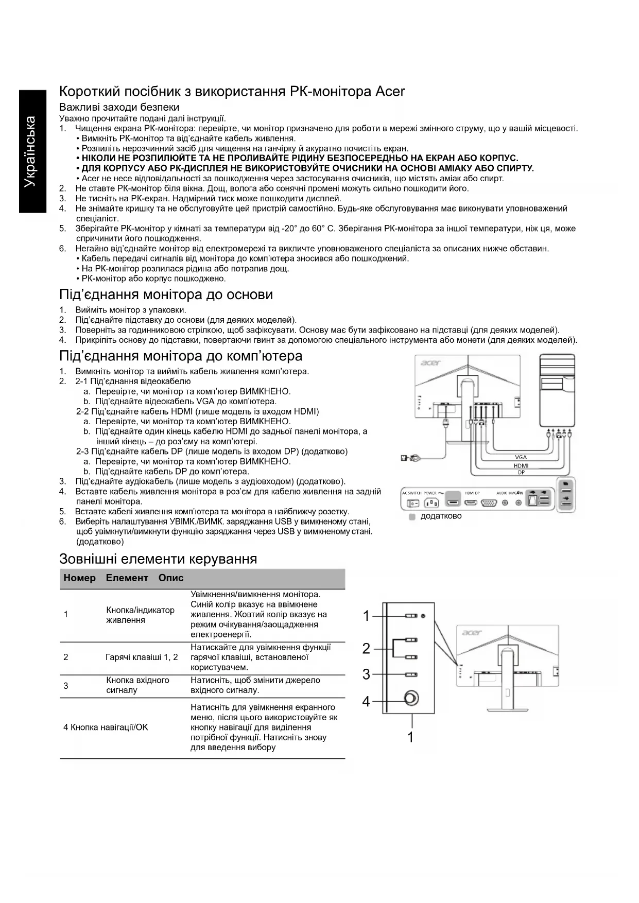 4Українська Правові норми та заходи безпеки Повідомлення Федеральної комісії зв’язку Цей пристрій пройшов перевірку та відповідає обмеженням для цифрових пристроїв класу В, як передбачено частиною 15 Правил Федеральної комісії зв’язку. Ці обмеження призначено для забезпечення належного захисту від шкідливих перешкод ужитловому середовищі. Цей пристрій створює, використовує та може випромінювати радіочастотну енергію, а тому, уразі встановлення та використання із порушенням інструкцій, може призводити до виникнення шкідливих перешкод для радіозв’язку Проте немає жодної гарантії, що упевному варіанті встановлення перешкоди не виникатимуть. Якщо цей пристрій створює перешкоди для прийому радіосигналу або телевізійного сигналу, що можна перевірити шляхом вимикання та вмикання пристрою, рекомендується спробувати усунути перешкоди одним із наведених способів. Налаштуйте або змініть розташування прийомної антени. Збільшіть відстань між пристроєм і приймачем. Під’єднайте пристрій та приймач до різних розеток. Зверніться за допомогою до дилера або досвідченого телерадіотехніка. Заява про відповідність ЄС Цим повідомленням компанія Acer Inc. стверджує, що цей РК-монітор відповідає важливим вимогам та іншим відповідним умовам Директиви щодо електромагнітної сумісності 2014/30/EU, Директиви щодо низької напруги 2014/35/EU, Директиви про обмеження вмісту шкідливих речовин 2011/65/EU та Директиви 2009/125/EC щодо визначення норм для встановлення вимог стосовно екодизайну для виробу, пов’язаного з енергією.