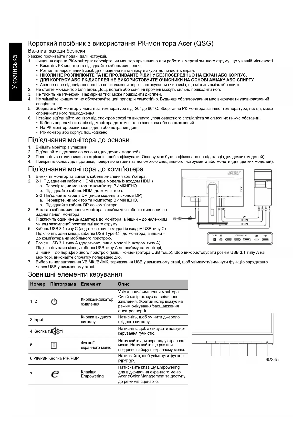 через USB у вимкненому стані. Зовнішні елементи керування Номер Піктограма Елемент Опис 1, 2 Кнопка/індикатор живлення Увімкнення/вимкнення монітора. Синій колір вказує на ввімкнене живлення. Жовтий колір вказує на режим очікування/заощадження електроенергії.3 InputКнопка вхідного сигналу Натисніть, щоб змінити джерело вхідного сигналу.4 Кнопка гучності Натисніть, щоб активувати повзунок керування гучністю. Функції екранного меню Натискайте для перегляду екранного меню. Натискайте ще раз для введення вибору в екранному меню. 6 PIP/PBP Кнопка PIP/PBP Натискайте, щоб увімкнути функцію PIP/PBP. Клавіша EmpoweringНатискайте клавішу Empowering для відкривання екранного меню Acer eColor Management та доступу до режимів сценарію. HDMIHDMI DP