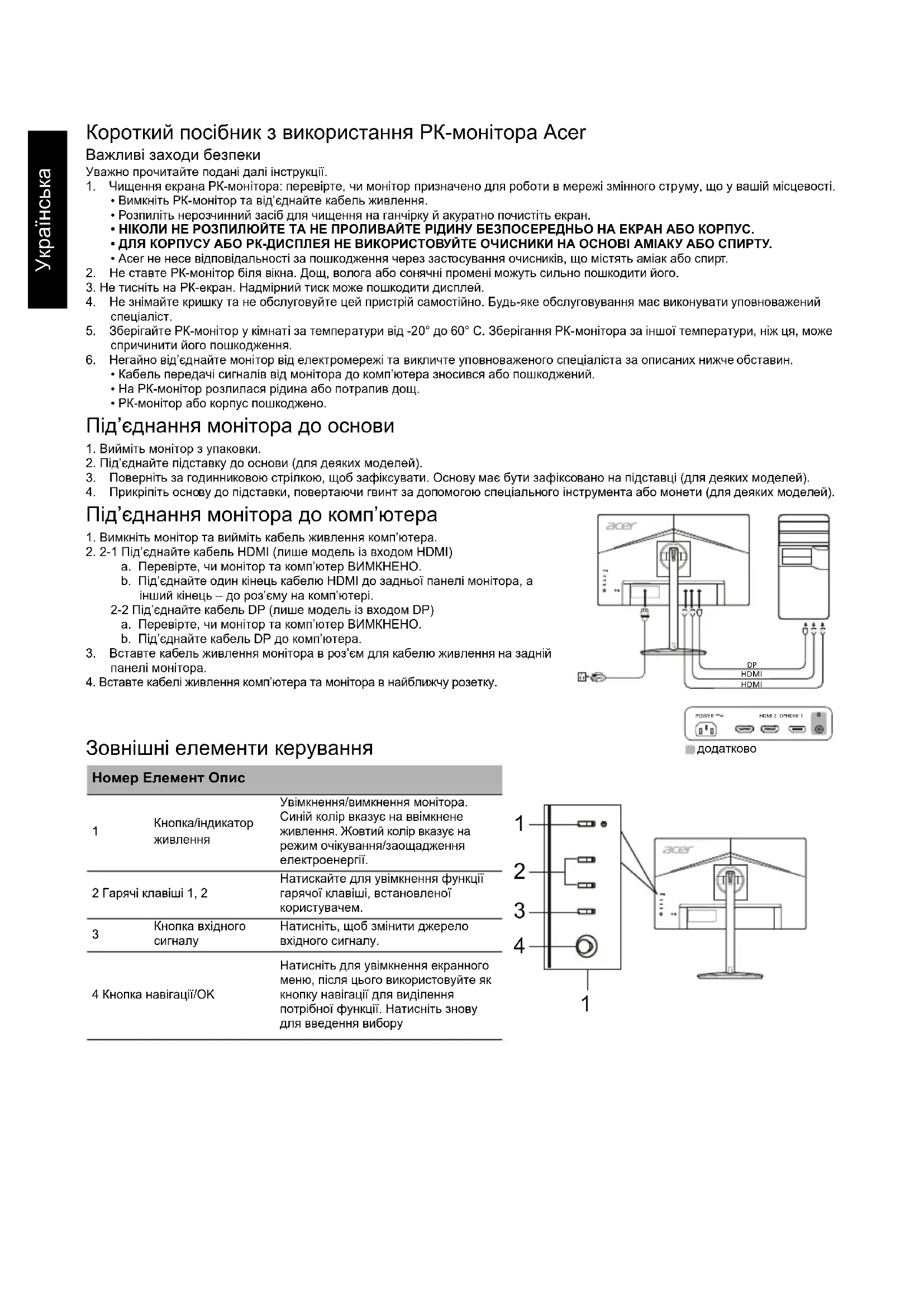 - Кабель передачі сигналів від монітора до комп’ютера зносився або пошкоджений. • На РК-монітор розлилася рідина або потрапив дощ. • РК-монітор або корпус пошкоджено. Під’єднання монітора до основи