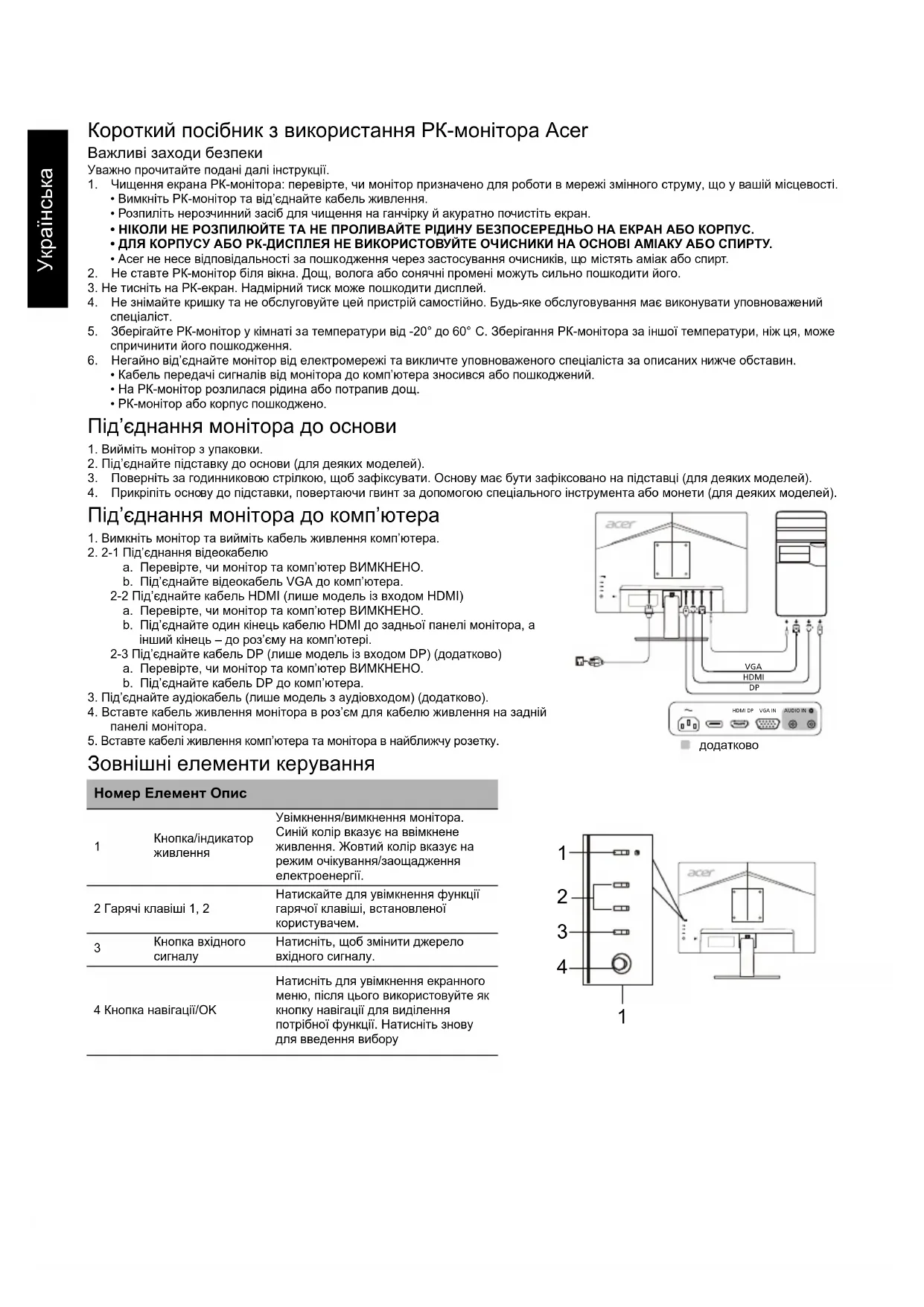 4. Прикріпіть основу до підставки, повертаючи гвинт за допомогою спеціального інструмента або монети (для деяких моделей). Під’єднання монітора до комп’ютера 1. Вимкніть монітор та вийміть кабель живлення комп’ютера.2. 2-1 Під’єднання відеокабелюa. Перевірте, чи монітор та комп’ютер ВИМКНЕНО.b. Під’єднайте відеокабель VGA до комп’ютера. 2-2 Під’єднайте кабель HDMI (лише модель із входом HDMI)a. Перевірте, чи монітор та комп’ютер ВИМКНЕНО.b. Під’єднайте один кінець кабелю HDMI до задньої панелі монітора, а інший кінець – до роз’єму на комп’ютері.2-3 Під’єднайте кабель DP (лише модель із входом DP) (додатково)a. Перевірте, чи монітор та комп’ютер ВИМКНЕНО.b. Під’єднайте кабель DP до комп’ютера.3. Під’єднайте аудіокабель (лише модель з аудіовходом) (додатково).4. Вставте кабель живлення монітора в роз’єм для кабелю живлення на задній панелі монітора.5. Вставте кабелі живлення комп’ютера та монітора в найближчу розетку. Зовнішні елементи керування Номер Елемент Опис