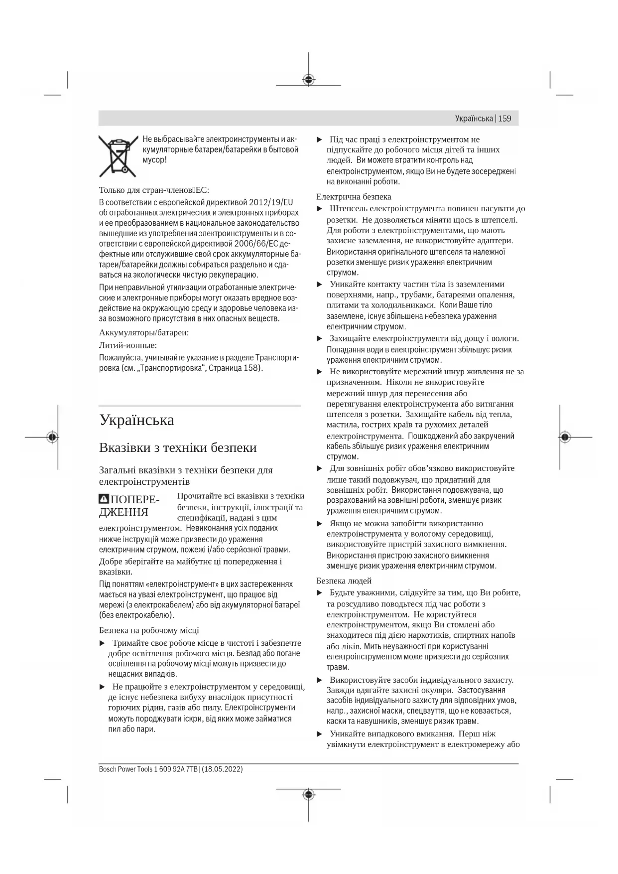 Лише для країнЄС: Відповідно до Європейської Директиви 2012/19/EU щодо відходів електричного та електронного обладнання та її перетворення в національне законодавство електроінструменти, які більше не придатні до використання, а також відповідно до Європейської Директиви 2006/66/EC несправні або відпрацьовані акумуляторні батареї/батарейки повинні здаватися окремо і утилізуватися екологічно чистим способом. При неправильній утилізації відпрацьовані електричні та електронні прилади можуть мати шкідливий вплив на навколишнє середовище та здоров’я людини через можливу наявність небезпечних речовин. Акумулятори/батарейки: Літієво-іонні: Будь ласка, зважайте на вказівки в розділі Транспортування (див. „Транспортування“, Сторінка168).