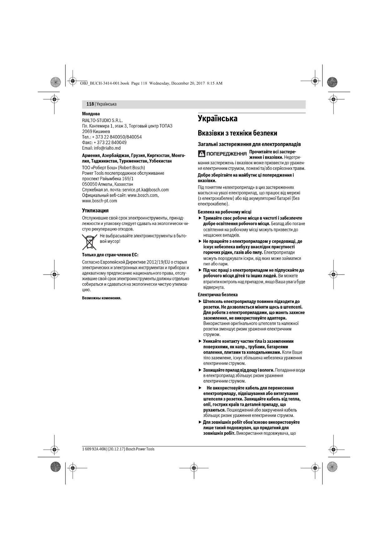 При всіх додаткових запитаннях та замовленні запчастин, будь ласка, зазначайте 10-значний номер для замовлення, що стоїть на паспортній табличці продукту. OBJ_BUCH-3414-001.book Page 124 Wednesday, December 20, 2017 8:15 AMҚaзақша | 125 Bosch Power Tools 1 609 92A 46N | (20.12.17) Гарантійне обслуговування і ремонт електроінструменту здійснюються відповідно до вимог і норм виготовлювача на території всіх країн лише у фірмових або авторизованих сервісних центрах фірми «Роберт Бош». ПОПЕРЕДЖЕННЯ! Використання контрафактної продукції небезпечне в експлуатації і може мати негативні наслідки для здоров’я. Виготовлення і розповсюдження контра- фактної продукції переслідується за Законом в адміністра- тивному і кримінальному порядку.