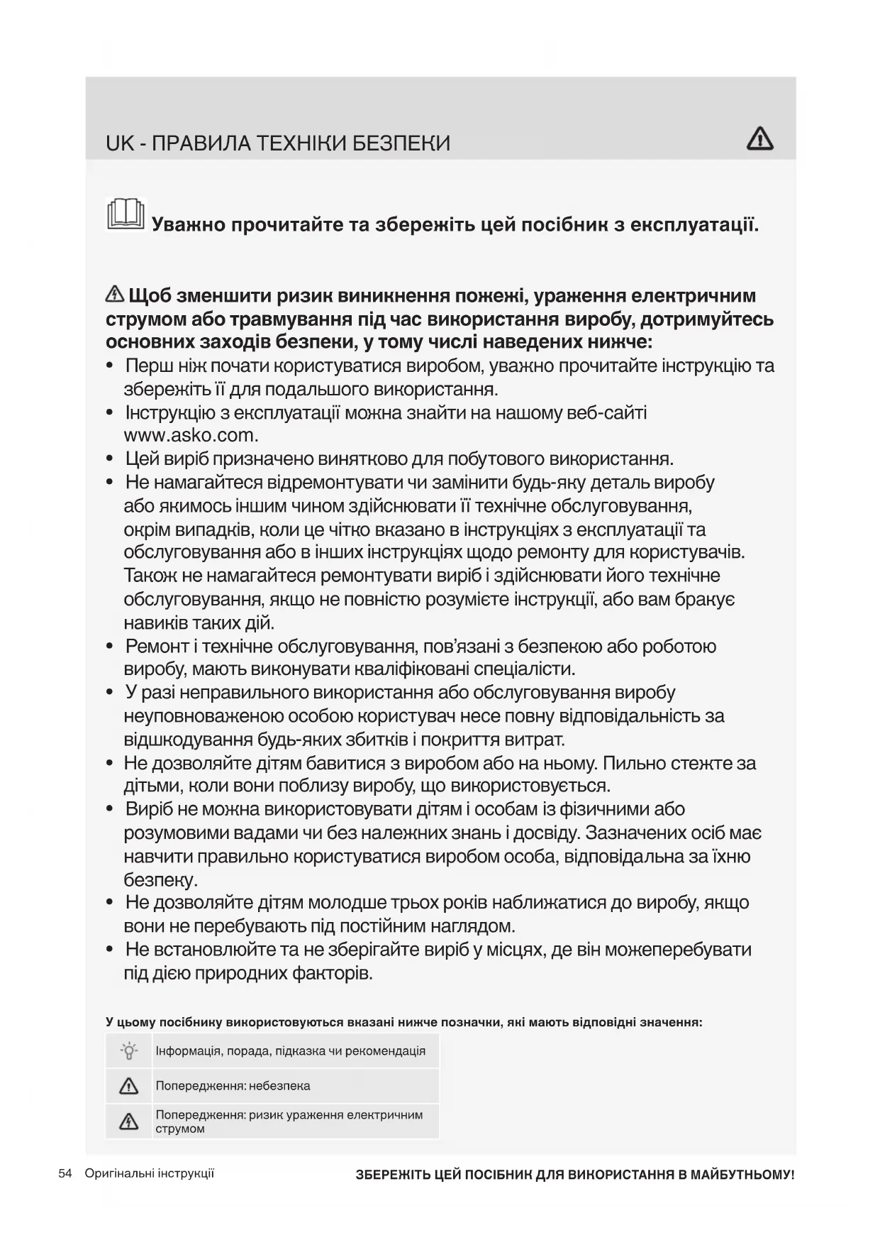 - Не встановлюйте та не зберігайте виріб у місцях, де він можеперебувати під дією природних факторів. Оригінальні інструкції ЗБЕРЕЖІТЬ ЦЕЙ ПОСІБНИК ДЛЯ ВИКОРИСТАННЯ В МАЙБУТНЬОМУ! У цьому посібнику використовуються вказані нижче позначки, які мають відповідні значення: Інформація, порада, підказка чи рекомендація Попередження: небезпека Попередження: ризик ураження електричним струмом55 Висувну полицю можна використовувати лише з пральною машиною та сушаркою для білизни компанії- виробника Asko Appliances.