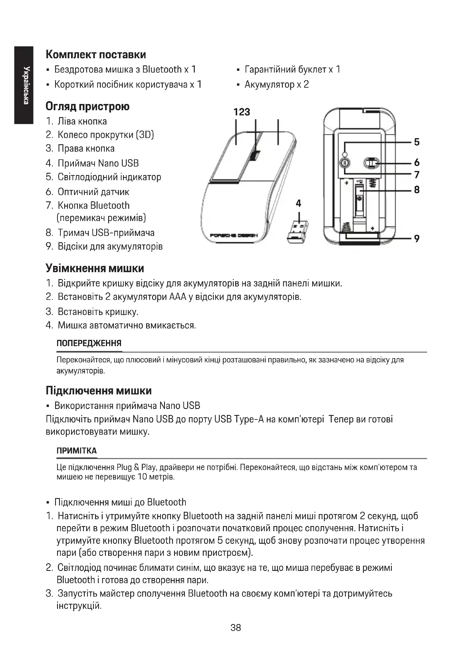 ПОПЕРЕДЖЕННЯ Переконайтеся, що плюсовий і мінусовий кінці розташовані правильно, як зазначено на відсіку для акумуляторів. Підключення мишки