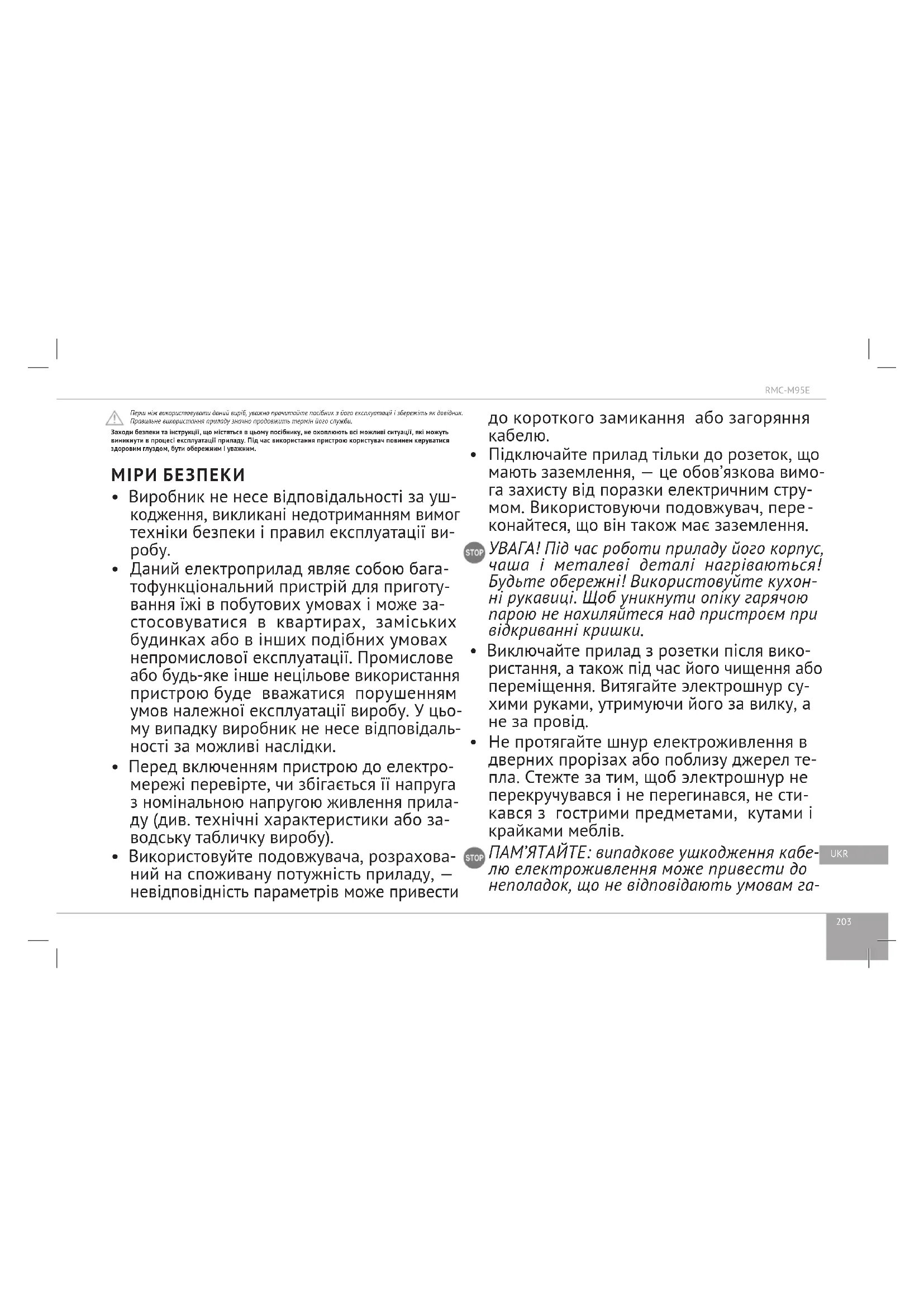 - Заборонено самостійний ремонт приладу або внесення змін у його конструкцію. Усі роботи з обслуговування і ремонту повин- нi виконуватися авторизованим сервіс-цен- тром. Непрофесійно виконана робота може привести до поломки приладу, травмам і ушкодженню майна. УВАГА! Заборонено використання приладу за будь-яких несправностей.RMC-M95E