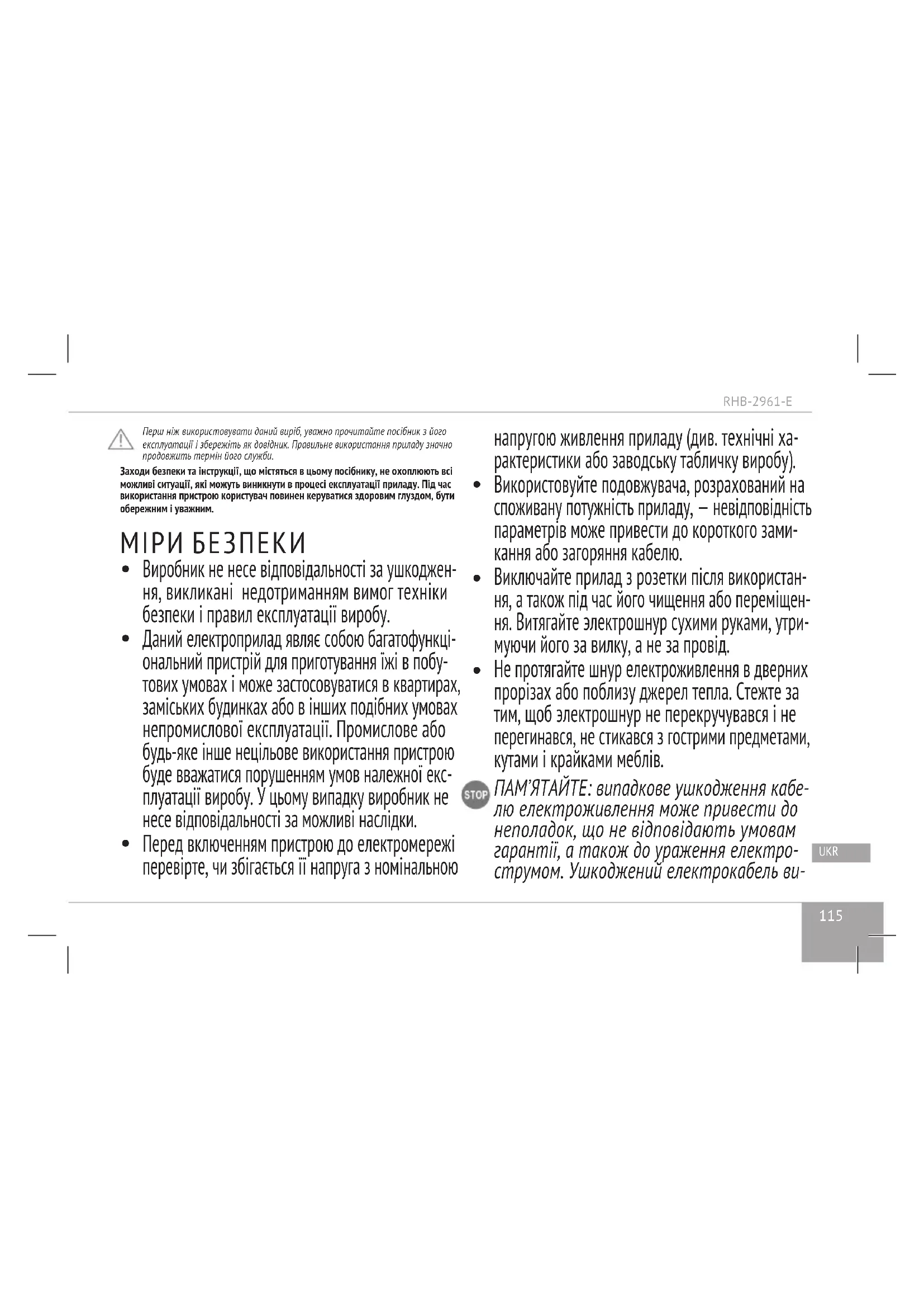 (стор. 6). Не використовуйте під час очищення приладу абразивні засоби, хімічно агресив- ні або інші речовини, не рекомендовані для застосування з предметами, що контактують із їжею.RHB-2961-E