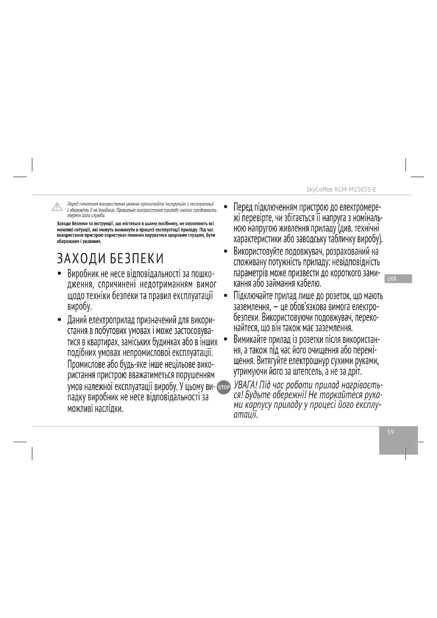 Дітям віком від 8 років, а також особам із обме- женими фізичними, сенсорними чи розумовими здібностями або з недостатнім досвідом чи знан- нями можна користуватися приладом лише під наглядом і в тому разі, якщо їх було проінструк- товано стосовно безпечного використання при-SkyCoffee RCM-M1505S-E