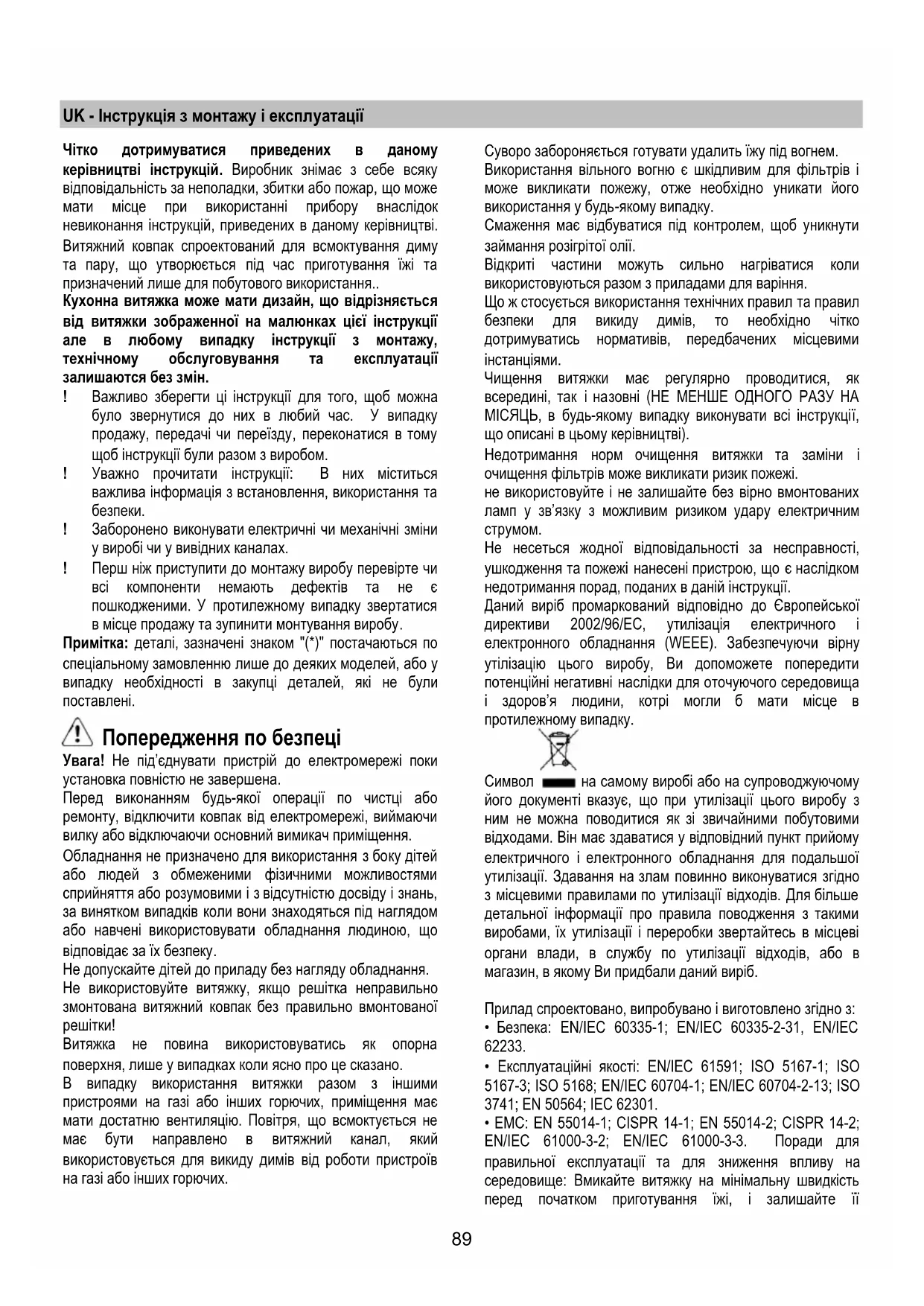 Угольный фильтр НЕ подлежит мойке или регенерации. Круглый угольный фильтр Покрыть фильтрами обе стороны для зачехления защитных решеток ротора двигателя, после чего вращать фильтр по часовой стрелке. Для снятия - вращать против часовой стрелки. Замена ламп Вытяжка оборудована освещением на светодиодах LED. Светодиоды обеспечивают оптимальное освещение, их срок службы в 10 раз превышает срок работы традиционных лампочек, и позволяют экономить 90% электроэнергии. Для замены светодиодов обращаться в службу технического обслуживания.89 UK - Інструкція з монтажу і експлуатації Чітко дотримуватися приведених в даному керівництві інструкцій. Виробник знімає з себе всяку відповідальність за неполадки, збитки або пожар, що може мати місце при використанні прибору внаслідок невиконання інструкцій, приведених в даному керівництві. Витяжний ковпак спроектований для всмоктування диму та пару, що утворюється під час приготування їжі та призначений лише для побутового використання.. Кухонна витяжка може мати дизайн, що відрізняється від витяжки зображенної на малюнках цієї інструкції але в любому випадку інструкції з монтажу, технічному обслуговування та експлуатації залишаются без змін. ! Важливо зберегти ці інструкції для того, щоб можна було звернутися до них в любий час. У випадку продажу, передачі чи переїзду , переконатися в тому щоб інструкції були разом з виробом. ! Уважно прочитати інструкції: В них міститься важлива інформація з встановлення, використання та