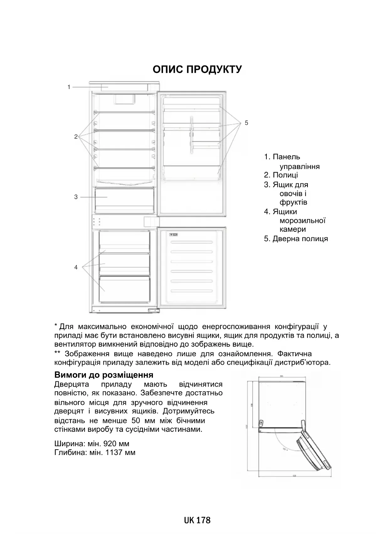 Вимоги до розміщення Дверцята приладу мають відчинятися повністю, як показано. Забезпечте достатньо вільного місця для зручного відчинення дверцят і висувних ящиків. Дотримуйтесь відстань не менше 50 мм між бічними стінками виробу та сусідніми частинами. Ширина: мін. 920 мм Глибина: мін. 1137 ммUK 179 ЕКСПЛУАТАЦІЯ A. Кнопка УВІМК/ВИМК, використовується для ввімкнення/вимкнення