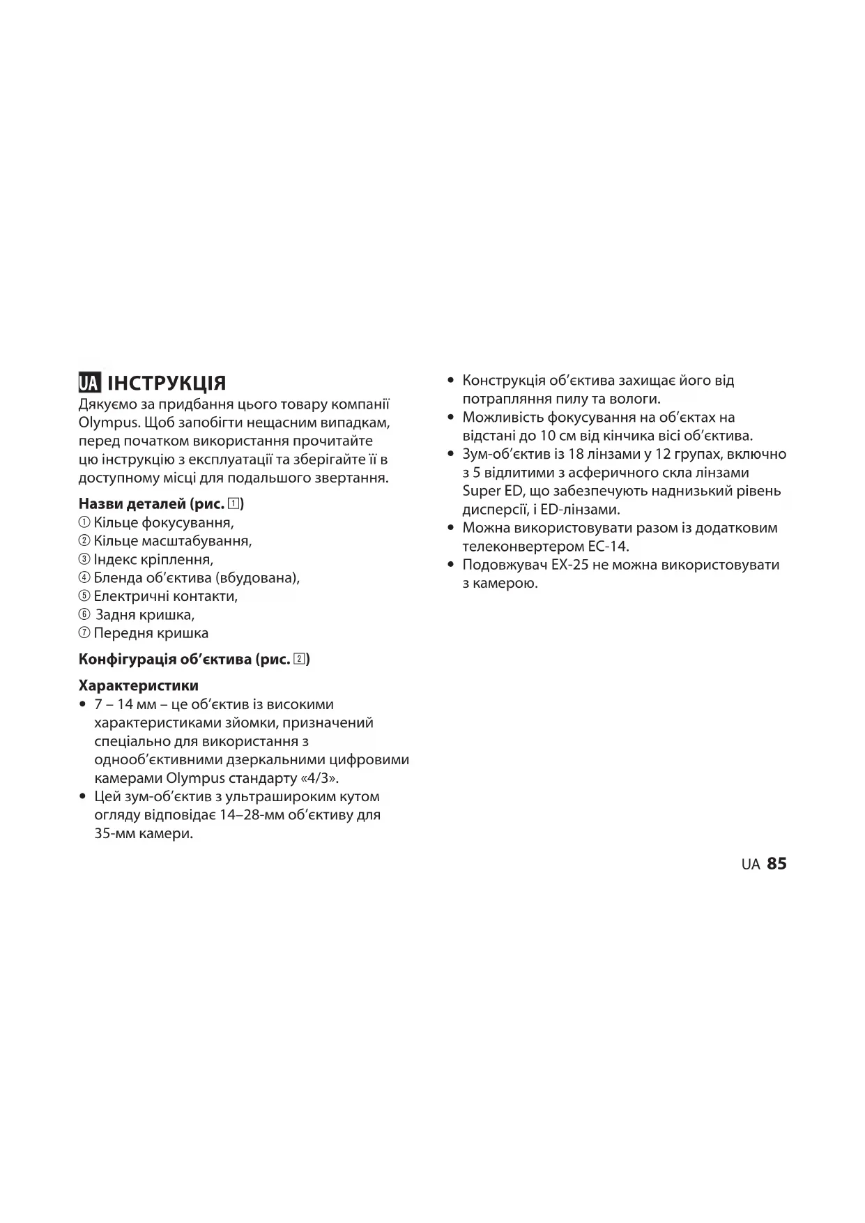Дякуємо за придбання цього товару компанії Olympus. Щоб запобігти нещасним випадкам, перед початком використання прочитайте цю інструкцію з експлуатації та зберігайте її в доступному місці для подальшого звертання. Назви деталей (рис. 1) 1 Кільце фокусування, 2 Кільце масштабування, 3 Індекс кріплення, 4 Бленда об’єктива (вбудована), 5 Електричні контакти, 6 Задня кришка, 7 Передня кришка Конфігурація об’єктива (рис. 2) Характеристики 7 – 14 мм – це об’єктив із високими характеристиками зйомки, призначений спеціально для використання з однооб’єктивними дзеркальними цифровими камерами Olympus стандарту «4/3». Цей зум-об’єктив з ультрашироким кутом огляду відповідає 14–28-мм об’єктиву для 35-мм камери.