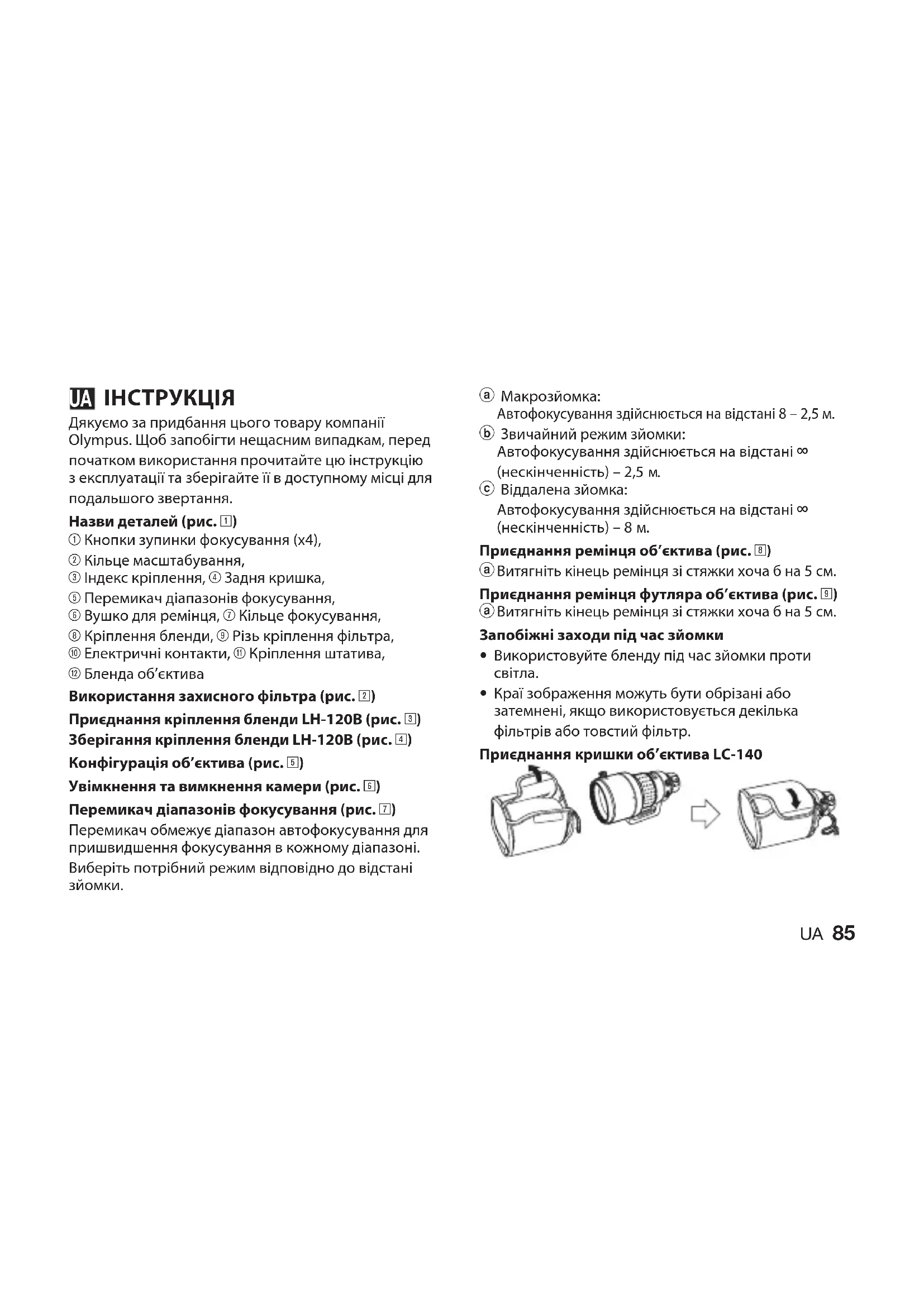 Дякуємо за придбання цього товару компанії Olympus. Щоб запобігти нещасним випадкам, перед початком використання прочитайте цю інструкцію з експлуатації та зберігайте її в доступному місці для подальшого звертання. Назви деталей (рис. 1) 1 Кнопки зупинки фокусування (x4), 2 Кільце масштабування, 3 Індекс кріплення, 4 Задня кришка, 5 Перемикач діапазонів фокусування, 6 Вушко для ремінця, 7 Кільце фокусування, 8 Кріплення бленди, 9 Різь кріплення фільтра, 0 Електричні контакти, q Кріплення штатива, w Бленда об’єктива Використання захисного фільтра (рис. 2) Приєднання кріплення бленди LH-120B (рис. 3) Зберігання кріплення бленди LH-120B (рис. 4) Конфігурація об’єктива (рис. 5) Увімкнення та вимкнення камери (рис. 6) Перемикач діапазонів фокусування (рис. 7) Перемикач обмежує діапазон автофокусування для пришвидшення фокусування в кожному діапазоні. Виберіть потрібний режим відповідно до відстані