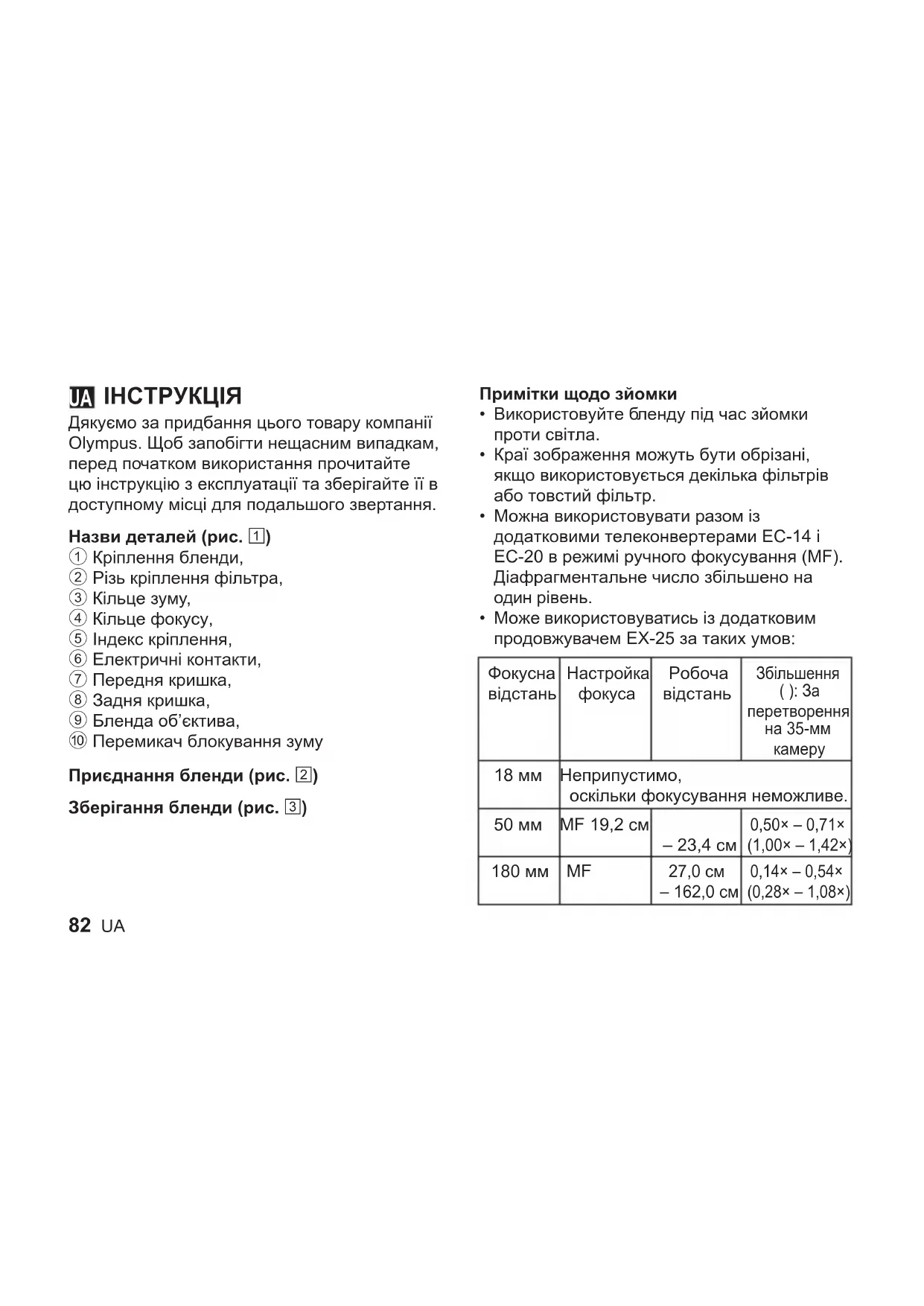 Дякуємо за придбання цього товару компанії Olympus. Щоб запобігти нещасним випадкам, перед початком використання прочитайте цю інструкцію з експлуатації та зберігайте її в доступному місці для подальшого звертання. Назви деталей (рис. 1) 1 Кріплення бленди, 2 Різь кріплення фільтра, 3 Кільце зуму, 4 Кільце фокусу, 5 Індекс кріплення, 6 Eлектричні контакти, 7 Передня кришка, 8 Задня кришка, 9 Бленда об’єктива, 0 Перемикач блокування зуму Приєднання бленди (рис. 2) Зберігання бленди (рис. 3) Примітки щодо зйомки Використовуйте бленду під час зйомки проти світла. Краї зображення можуть бути обрізані, якщо використовується декілька фільтрів або товстий фільтр. Можна використовувати разом із додатковими телеконвертерами EC-14 і EC-20 в режимі ручного фокусування (MF). Діафрагментальне число збільшено на один рівень. Може використовуватись із додатковим продовжувачем EX-25 за таких умов: