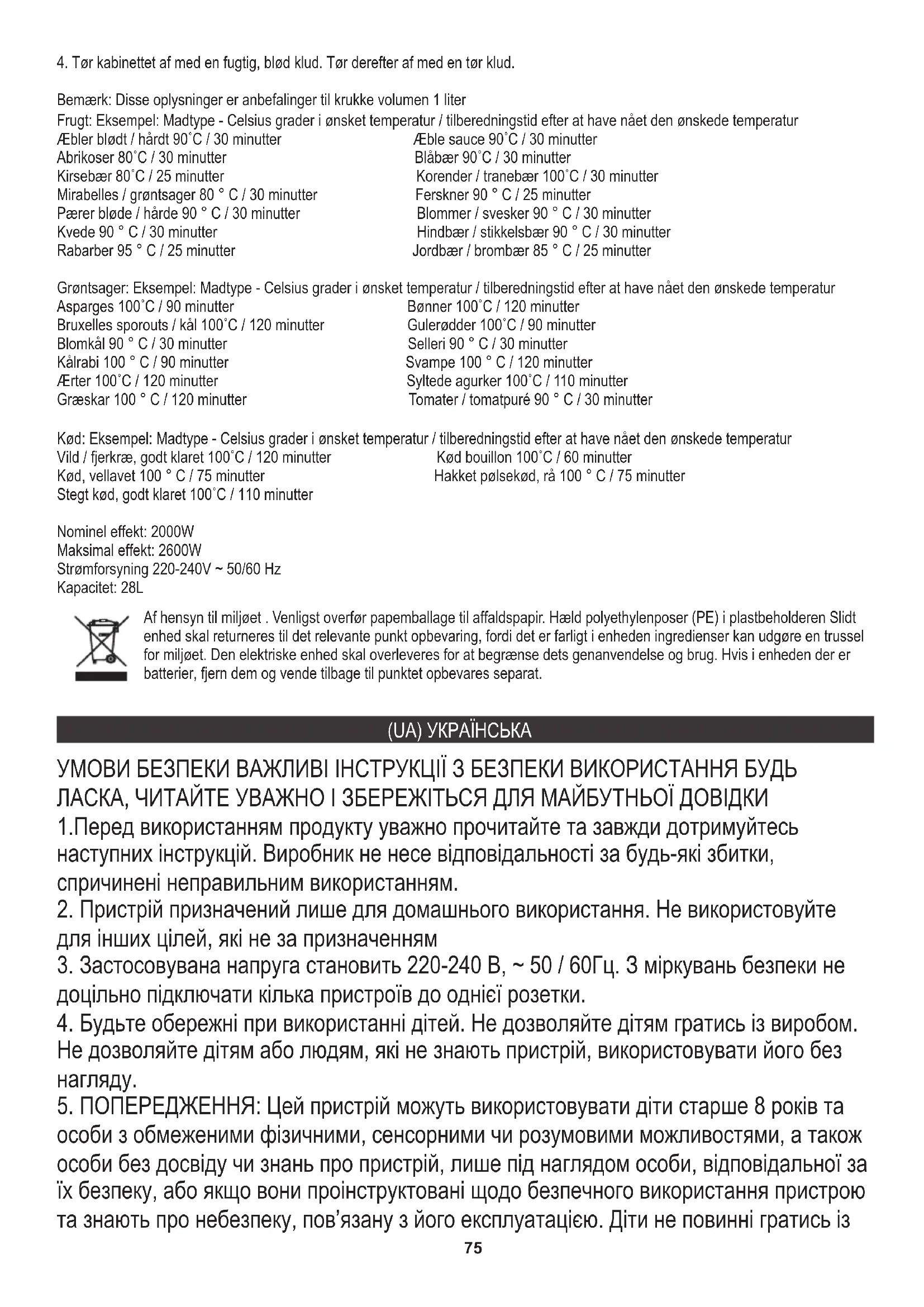 Фрукти: Приклад: Тип їжі - градуси Цельсія за бажаної температури / часу готування після досягнення бажаної температури Абрикоси 80˚C / 30 хвилин Чорниця 90˚C / 30 хвилин Прибирання: Груші м’які / тверді 90˚C / 30 хвилин Сливи / чорнослив 90˚C / 30 хвилин Айва 90˚C / 30 хвилин Малина / агрус 90˚C / 30 хвилин Вишня 80˚C / 25 хвилин Смородина / журавлина 100˚C / 30 хвилин Ревінь 95˚C / 25 хвилин Полуниця / ожина 85˚C / 25 хвилин Овочі: Приклад: Тип їжі - градуси Цельсія за бажаної температури / часу готування після досягнення бажаної температури Нагрівання рідин Гарбуз 100˚C / 120 хвилин Помідори / томатна паста 90˚C / 30 хвилин Максимальна потужність: 2600 Вт Ємність: 28л М'ясо: Приклад: Тип їжі - градуси Цельсія за бажаної температури / часу готування після досягнення бажаної температури М’ясо, добре пророблене 100˚C / 75 хвилин М’ясне ковбасне м’ясо, сире 100˚C / 75 хвилин Дичина / птиця, добре зроблена 100˚C / 120 хвилин М’ясний бульйон 100˚C / 60 хвилин Номінальна потужність: 2000 Вт Горох 100˚C / 120 хвилин Мариновані корнішони 100˚C / 110 хвилин Блок живлення 220-240В ~ 50/60 Гц Смажене м’ясо, добре пророблене 100˚C / 110 хвилин У інтересах навколишнього середовища. Будь ласка, віддайте картонну упаковку в місце збору мукулатури. Політиленові мішки (PE) викинути в смітник для пластику. Відпрацьований пристрій повинен бути відправлений у відповідну точку зберігання, тому що в пристрої є небезпечні інгредієнти, які можуть становити загрозу навколишньому середовищу. Електричний пристрій потрібно повернути так, щоб обмежити його повторне використання. Якщо у пристрої є батерейки, то потрібно їх витягнути і віддати до відповідного пунтку.79