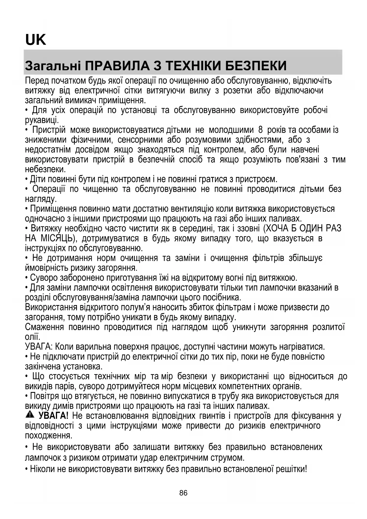 - Ніколи не використовувати витяжку без правильно встановленої решітки!87