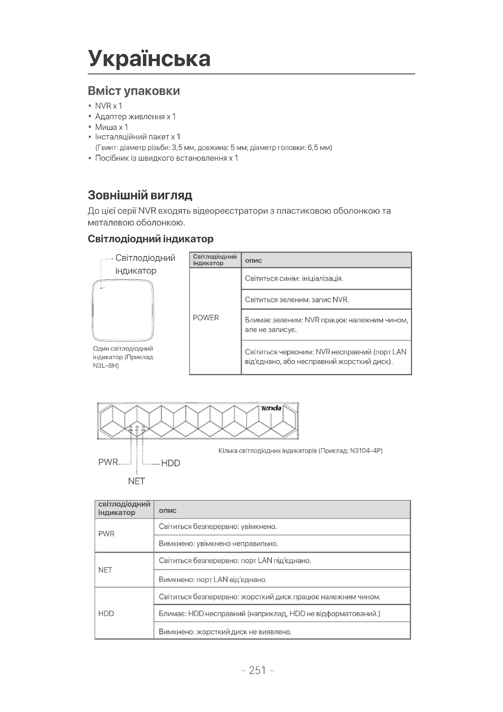 Вміст упаковки Зовнішній вигляд NVR x 1Адаптер живлення x 1Миша x 1Інсталяційний пакет x 1 (Гвинт: діаметр різьби: 3,5 мм, довжина: 5 мм; діаметр головки: 6,5 мм)Посібник із швидкого встановлення x 1 Світлодіодний індикатор До цієї серії NVR в¼одять відеореєстратори з пластиковою оболонкою та металевою оболонкою.POWER Світлодіодний