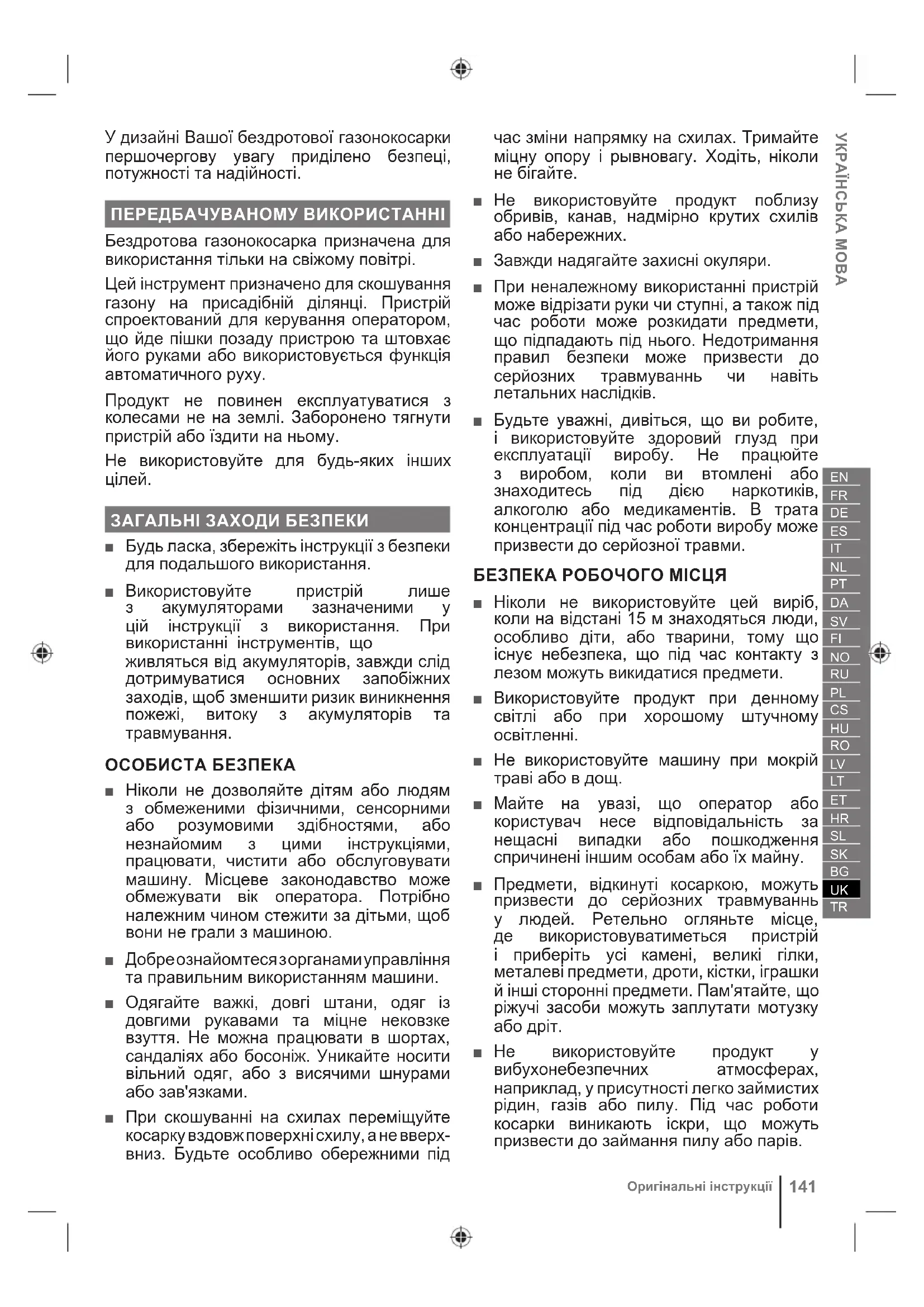 ЗАГАЛЬНІ ЗАХОДИ БЕЗПЕКИ ■ Будь ласка, збережіть інструкції з безпеки для подальшого використання. ■ Використовуйте пристрій лише з акумуляторами зазначеними у цій інструкції з використання. При використанні інструментів, що живляться від акумуляторів, завжди слід дотримуватися основних запобіжних заходів, щоб зменшити ризик виникнення пожежі, витоку з акумуляторів та травмування. ОСОБИСТА БЕЗПЕКА ■ Ніколи не дозволяйте дітям або людям з обмеженими фізичними, сенсорними або розумовими здібностями, або незнайомим з цими інструкціями, працювати, чистити або обслуговувати машину. Місцеве законодавство може обмежувати вік оператора. Потрібно належним чином стежити за дітьми, щоб вони не грали з машиною. ■ Добре ознайомтеся з органами управління та правильним використанням машини. ■ Одягайте важкі, довгі штани, одяг із довгими рукавами та міцне нековзке взуття. Не можна працювати в шортах, сандаліях або босоніж. Уникайте носити вільний одяг, або з висячими шнурами або зав'язками. ■ При скошуванні на схилах переміщуйте косарку вздовж поверхні схилу, а не вверх- вниз. Будьте особливо обережними під час зміни напрямку на схилах. Тримайте міцну опору і рывновагу. Ходіть, ніколи не бігайте. ■ Не використовуйте продукт поблизу обривів, канав, надмірно крутих схилів або набережних. ■ Завжди надягайте захисні окуляри. ■ При неналежному використанні пристрій може відрізати руки чи ступні, а також під час роботи може розкидати предмети, що підпадають під нього. Недотримання правил безпеки може призвести до серйозних травмуваннь чи навіть летальних наслідків. ■ Будьте уважні, дивіться, що ви робите, і використовуйте здоровий глузд при експлуатації виробу. Не працюйте з виробом, коли ви втомлені або знаходитесь під дією наркотиків, алкоголю або медикаментів. В трата концентрації під час роботи виробу може призвести до серйозної травми. БЕЗПЕКА РОБОЧОГО МІСЦЯ ■ Ніколи не використовуйте цей виріб, коли на відстані 15 м знаходяться люди, особливо діти, або тварини, тому що існує небезпека, що під час контакту з лезом можуть викидатися предмети. ■ Використовуйте продукт при денному світлі або при хорошому штучному освітленні. ■ Не використовуйте машину при мокрій траві або в дощ. ■ Майте на увазі, що оператор або користувач несе відповідальність за нещасні випадки або пошкодження спричинені іншим особам або їх майну. ■ Предмети, відкинуті косаркою, можуть призвести до серйозних травмуваннь у людей. Ретельно огляньте місце, де використовуватиметься пристрій і приберіть усі камені, великі гілки, металеві предмети, дроти, кістки, іграшки й інші сторонні предмети. Пам'ятайте, що ріжучі засоби можуть заплутати мотузку