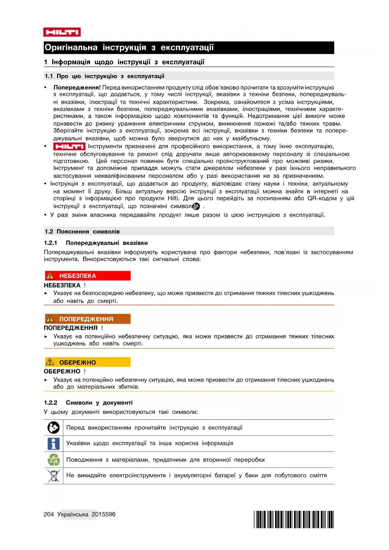 - Інструкція з експлуатації, що додається до продукту, відповідає стану науки і техніки, актуальному на момент її друку. Більш актуальну версію інструкції з експлуатації можна знайти в інтернеті на сторінці з інформацією про продукти Hilti. Для цього перейдіть за посиланням або QR-кодом у цій інструкції з експлуатації, що позначені символом .