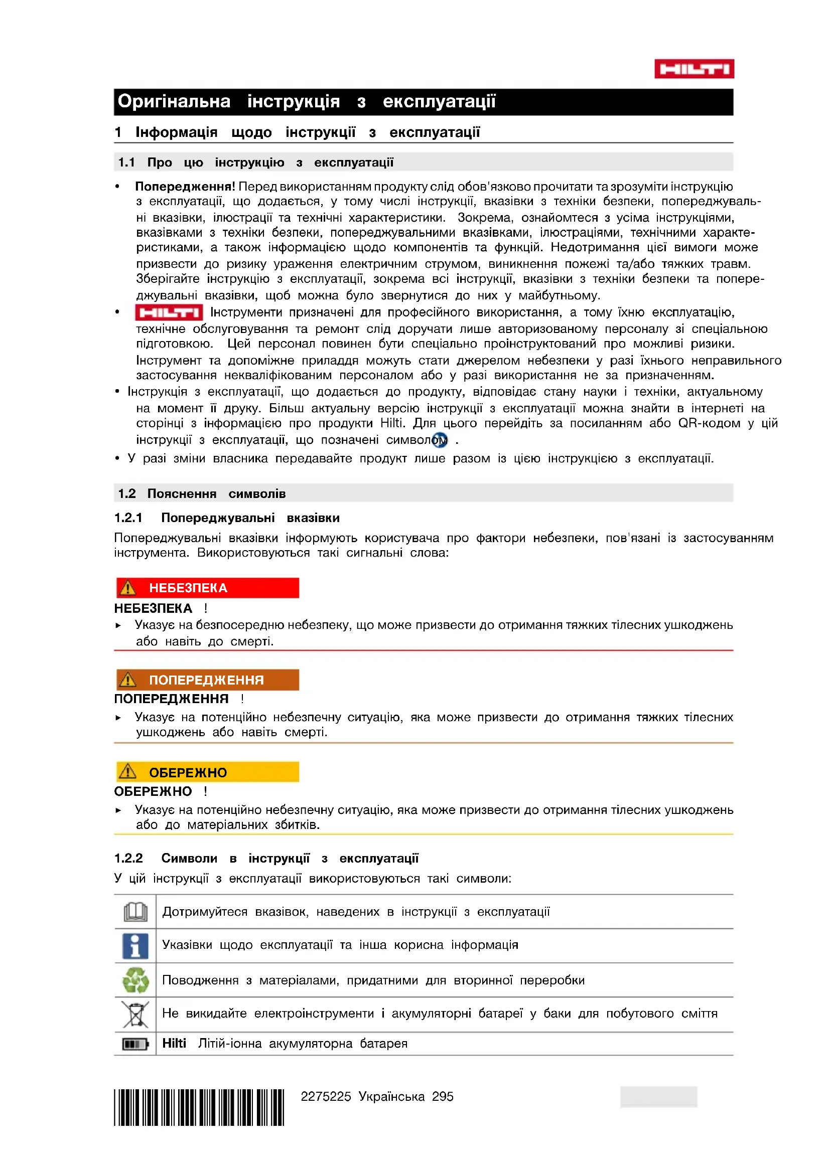 У цій інструкції з експлуатації використовуються такі символи: Дотримуйтеся вказівок, наведених в інструкції з експлуатації Указівки щодо експлуатації та інша корисна інформація Поводження з матеріалами, придатними для вторинної переробки Не викидайте електроінструменти і акумуляторні батареї у баки для побутового сміття Hilti Літій-іонна акумуляторна батарея296 Українська 2275225 *2275225* Hilti Зарядний пристрій