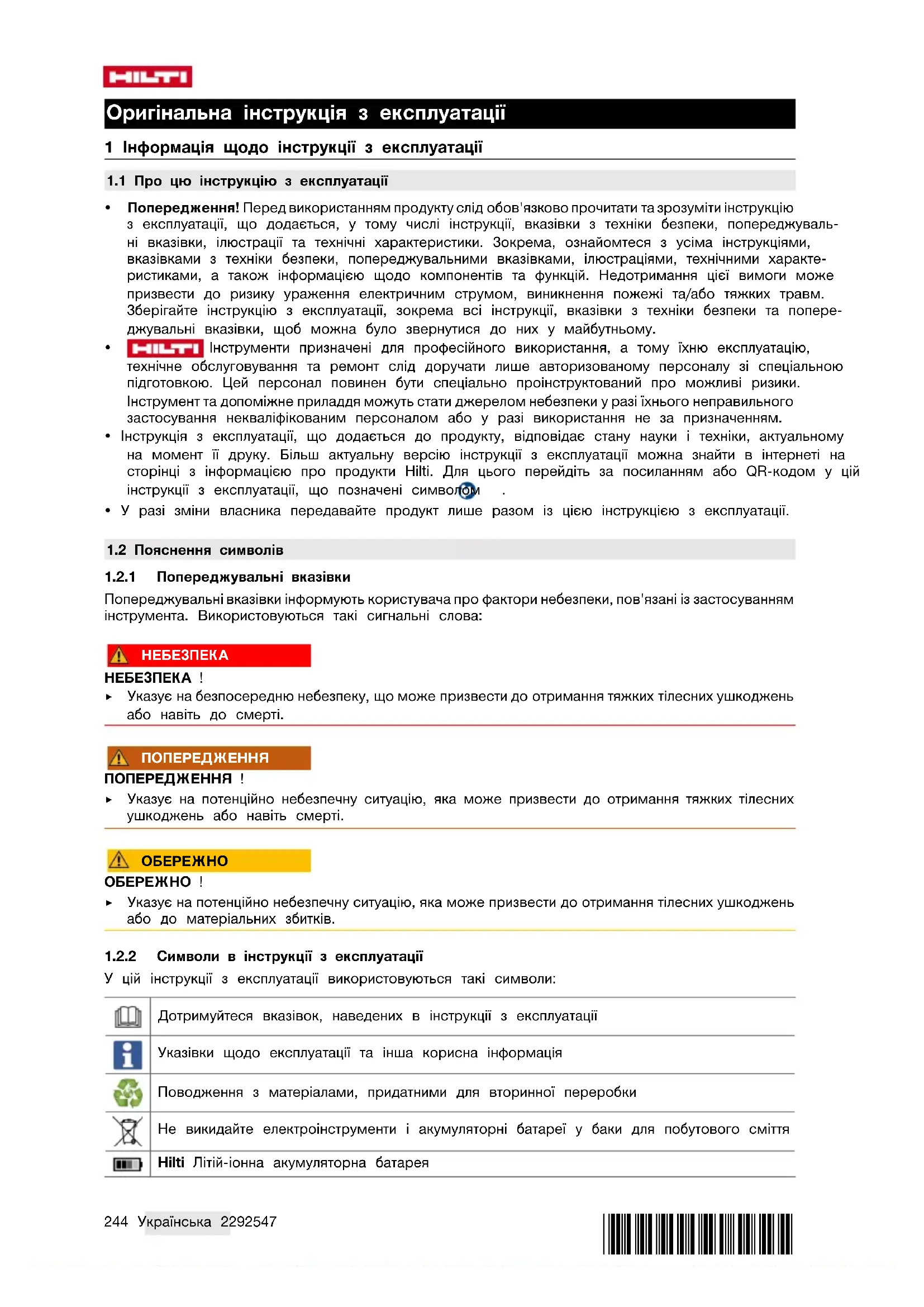 1.2.2 Символи в інструкції з експлуатації
