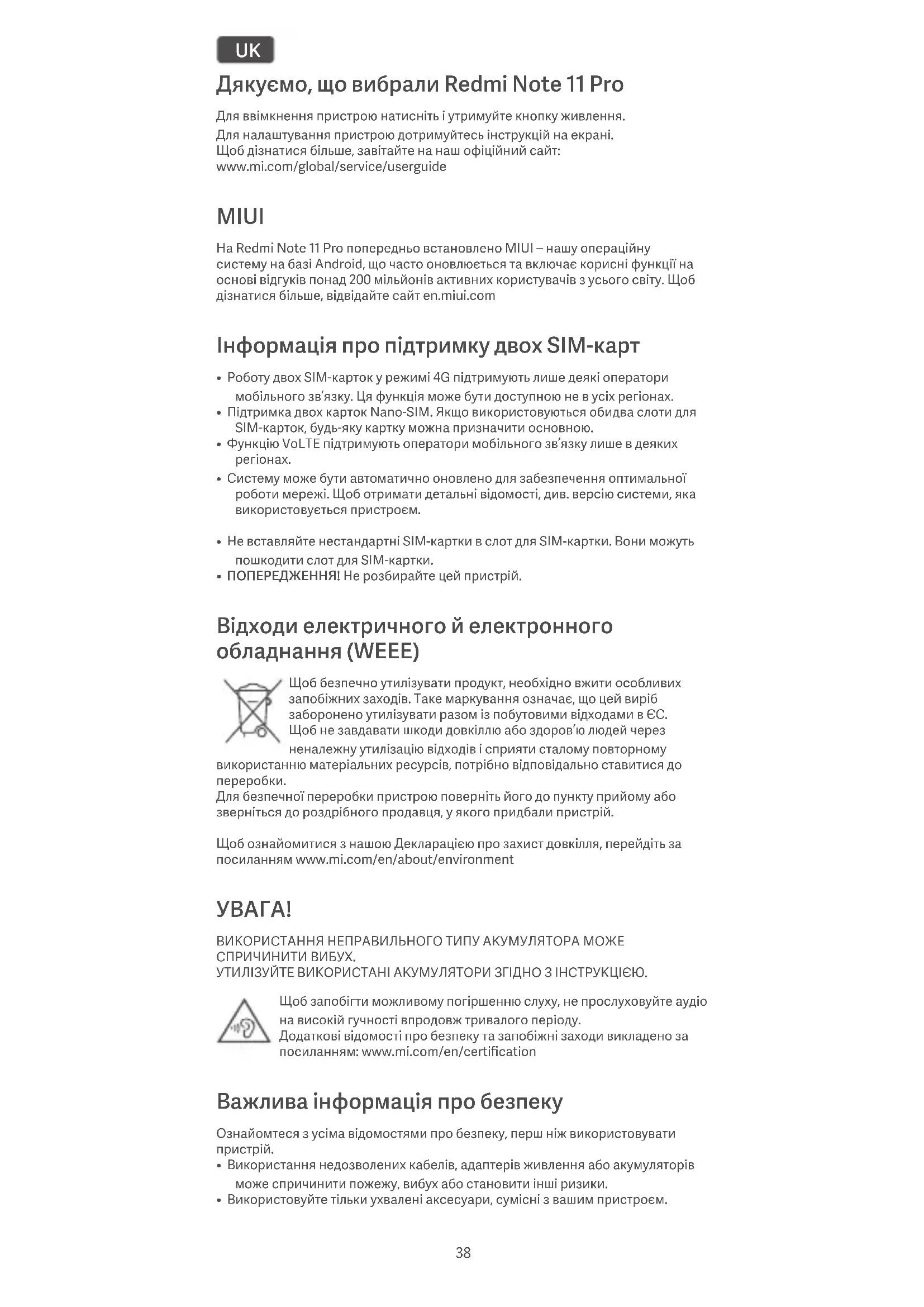 ВИКОРИСТАННЯ НЕПРАВИЛЬНОГО ТИПУ АКУМУЛЯТОРА МОЖЕ СПРИЧИНИТИ ВИБУХ. УТИЛІЗУЙТЕ ВИКОРИСТАНІ АКУМУЛЯТОРИ ЗГІДНО З ІНСТРУКЦІЄЮ. Щоб запобігти можливому погіршенню слуху, не прослуховуйте аудіо на високій гучності впродовж тривалого періоду. Додаткові відомості про безпеку та запобіжні заходи викладено за посиланням: www.mi.com/en/certification Важлива інформація про безпеку Ознайомтеся з усіма відомостями про безпеку, перш ніж використовувати