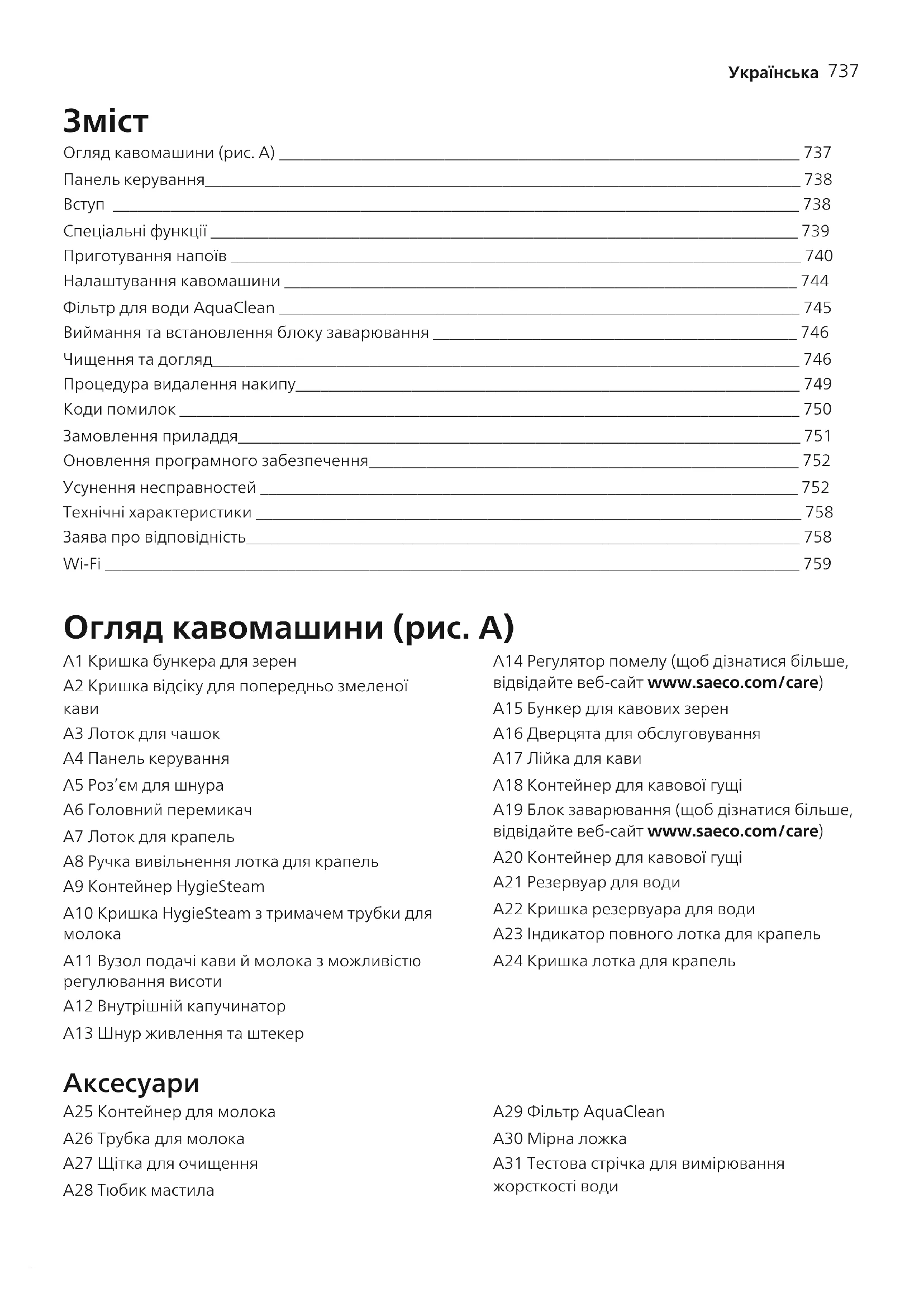 Огляд кавомашини (рис.A) _______________________________________________________________ 737 Панель керування________________________________________________________________________ 738 Вступ ___________________________________________________________________________________ 738 Спеціальні функції _______________________________________________________________________ 739 Приготування напоїв _____________________________________________________________________ 740 Налаштування кавомашини ______________________________________________________________ 744 Фільтр для води AquaClean _______________________________________________________________ 745 Виймання та встановлення блоку заварювання ____________________________________________ 746 Чищення та догляд_______________________________________________________________________ 746 Процедура видалення накипу_____________________________________________________________ 749 Коди помилок ___________________________________________________________________________ 750 Замовлення приладдя____________________________________________________________________ 751 Оновлення програмного забезпечення____________________________________________________ 752 Усунення несправностей _________________________________________________________________ 752 Технічні характеристики __________________________________________________________________ 758 Заява про відповідність___________________________________________________________________ 758 Wi-Fi ____________________________________________________________________________________ 759 Огляд кавомашини (рис.A) A1 Кришка бункера для зерен A2 Кришка відсіку для попередньо змеленої