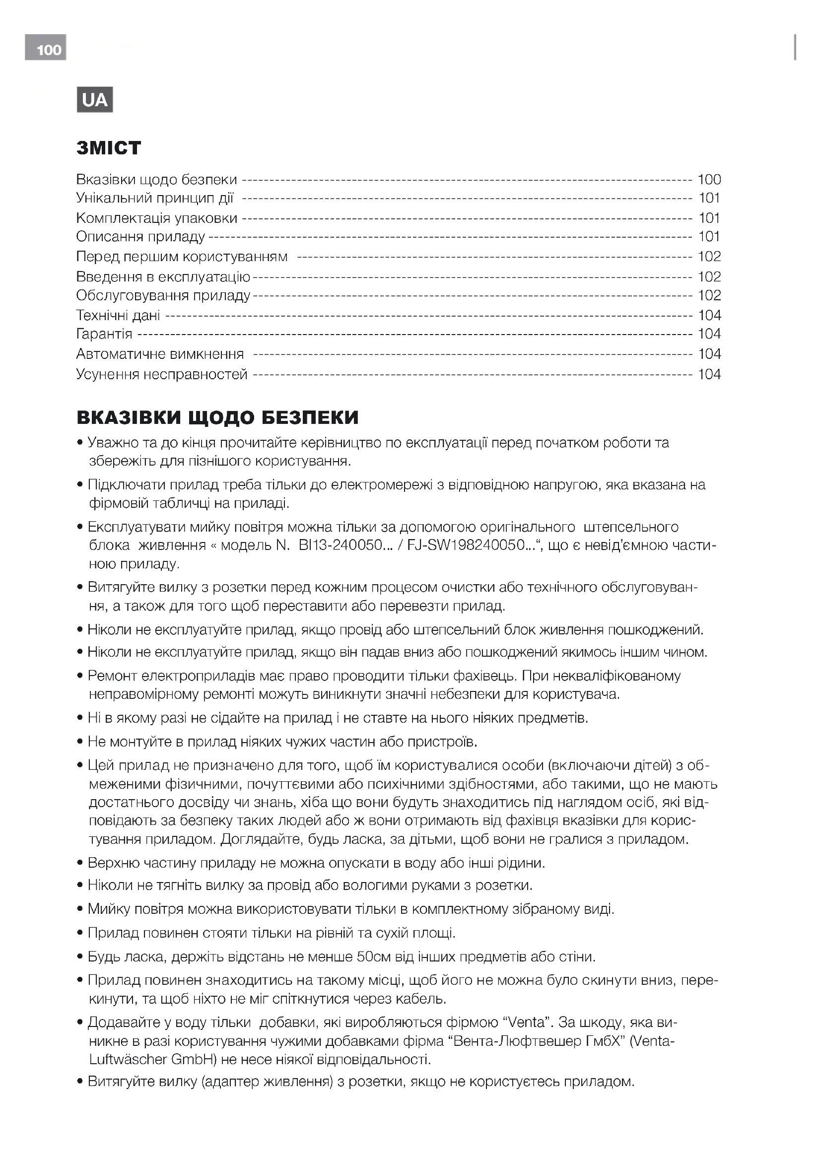 - Додавайте у воду тільки добавки, які виробляються фірмою “Venta”. За шкоду, яка ви- никне в разі користування чужими добавками фірма “Вента-Люфтвешер ГмбХ” (Venta- Luftwäscher GmbH) не несе ніякої відповідальності.