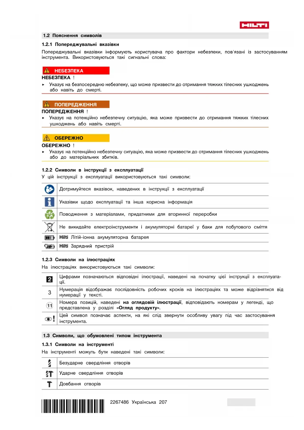 У цій інструкції з експлуатації використовуються такі символи: Дотримуйтеся вказівок, наведених в інструкції з експлуатації Указівки щодо експлуатації та інша корисна інформація Поводження з матеріалами, придатними для вторинної переробки Не викидайте електроінструменти і акумуляторні батареї у баки для побутового сміття Hilti Літій-іонна акумуляторна батарея Hilti Зарядний пристрій