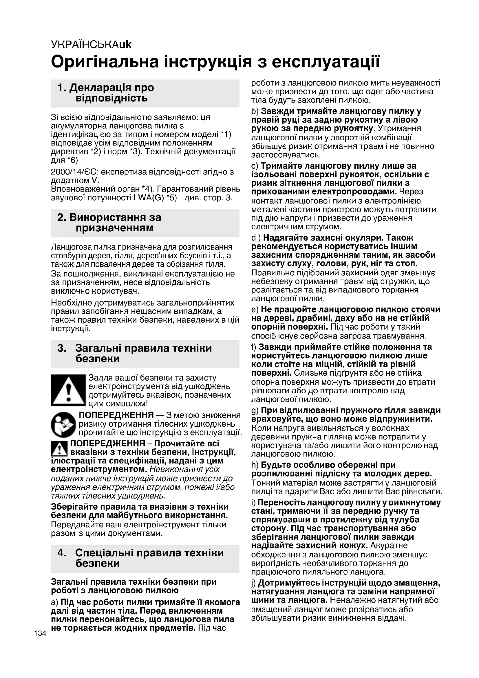Оригінальна інструкція з експлуатації Зі всією відповідальністю заявляємо: ця акумуляторна ланцюгова пилка з ідентифікацією за типом і номером моделі *1) відповідає усім відповідним положенням директив *2) і норм *3), Технічній документації для *6) 2000/14/ЄС: експертиза відповідності згідно з додатком V. Вповноважений орган *4). Гарантований рівень звукової потужності LWA(G) *5) - див. стор. 3. Ланцюгова пилка призначена для розпилювання стовбурів дерев, гілля, дерев'яних брусків і т.і., а також для повалення дерев та обрізання гілля. За пошкодження, викликані експлуатацією не за призначенням, несе відповідальність виключно користувач. Необхідно дотримуватись загальноприйнятих правил запобігання нещасним випадкам, а також правил техніки безпеки, наведених в цій інструкції. Задля вашої безпеки та захисту електроінструмента від ушкоджень дотримуйтесь вказівок, позначених цим символом! ПОПЕРЕДЖЕННЯ — З метою зниження ризику отримання тілесних ушкоджень прочитайте цю інструкцію з експлуатації. ПОПЕРЕДЖЕННЯ – Прочитайте всі вказівки з техніки безпеки, інструкції, ілюстрації та специфікації, надані з цим електроінструментом. Невиконання усіх поданих нижче інструкцій може призвести до ураження електричним струмом, пожежі і/або тяжких тілесних ушкоджень. Зберігайте правила та вказівки з техніки безпеки для майбутнього використання. Передавайте ваш електроінструмент тільки