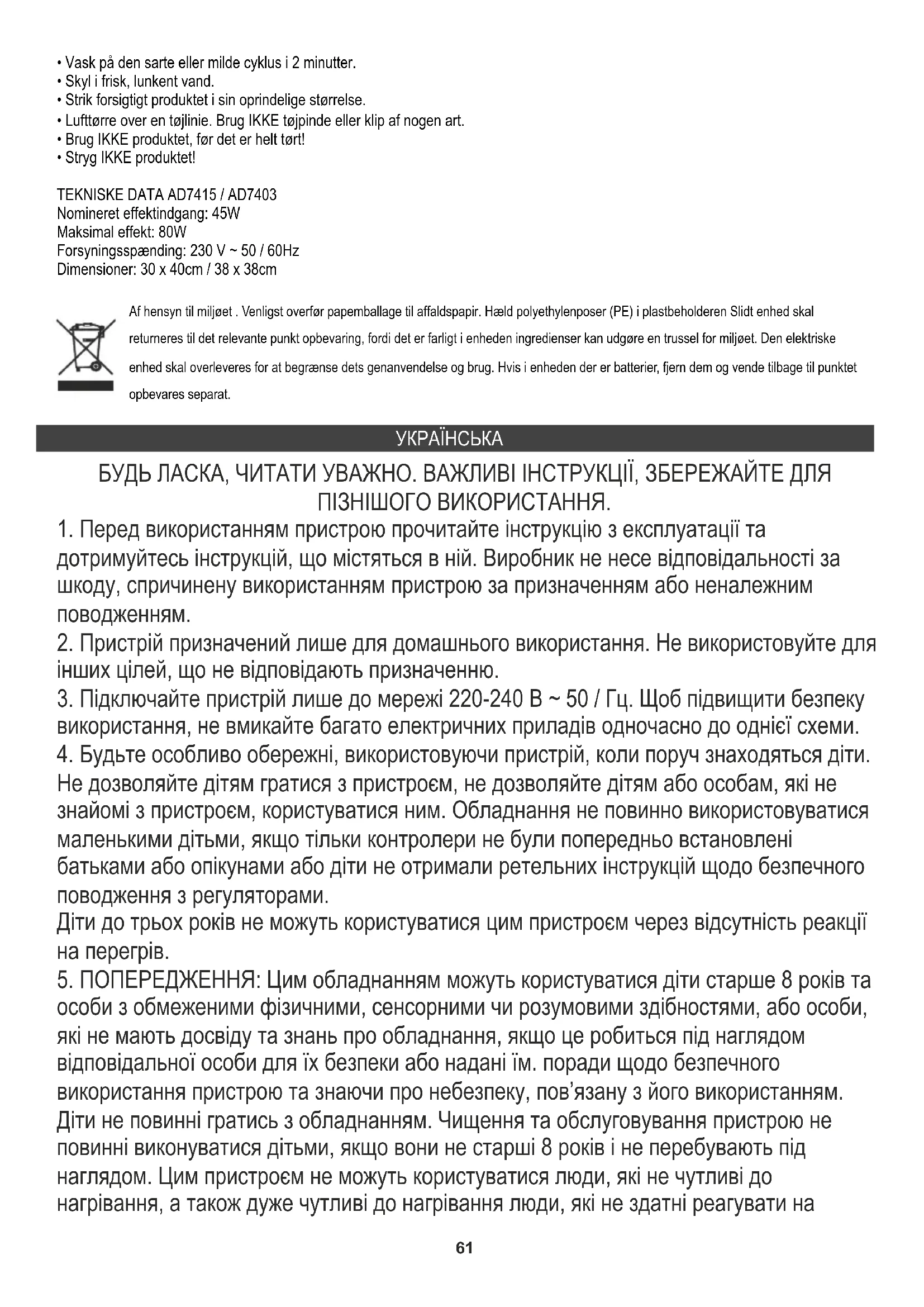 У інтересах навколишнього середовища. Будь ласка, віддайте картонну упаковку в місце збору мукулатури. Політиленові мішки (PE) викинути в смітник для пластику. Відпрацьований пристрій повинен бути відправлений у відповідну точку зберігання, тому що в пристрої є небезпечні інгредієнти, які можуть становити загрозу навколишньому середовищу. Електричний пристрій потрібно повернути так, щоб обмежити його повторне використання. Якщо у пристрої є батерейки, то потрібно їх витягнути і віддати до відповідного пунтку.