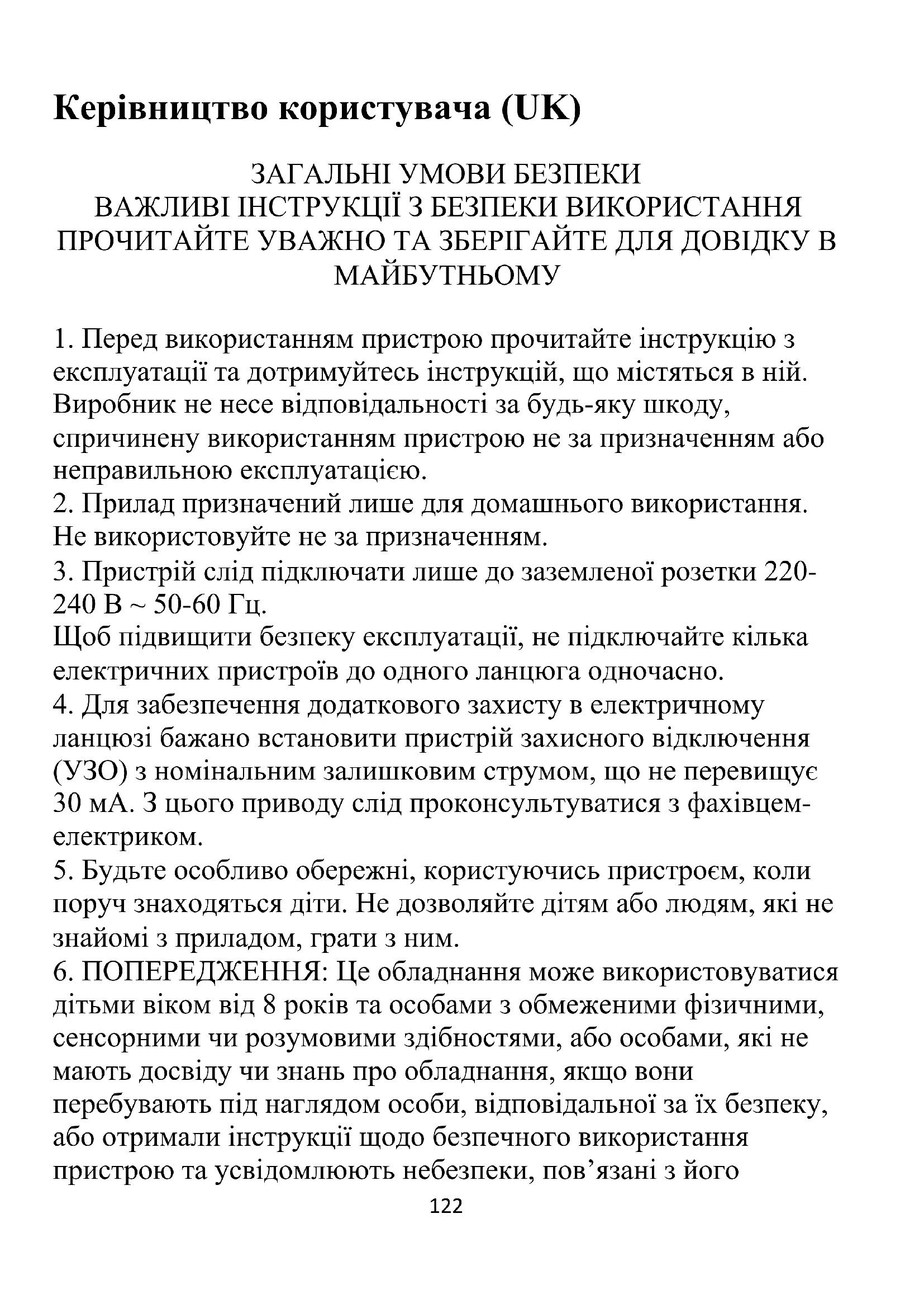дітьми віком від 8 років та особами з обмеженими фізичними, сенсорними чи розумовими здібностями, або особами, які не мають досвіду чи знань про обладнання, якщо вони перебувають під наглядом особи, відповідальної за їх безпеку, або отримали інструкції щодо безпечного використання пристрою та усвідомлюють небезпеки, пов’язані з його123 використанням. Діти не повинні гратися з обладнанням. Очищення та технічне обслуговування приладу не повинні виконувати діти, якщо вони не старші 8 років, і такі дії виконуються під наглядом.