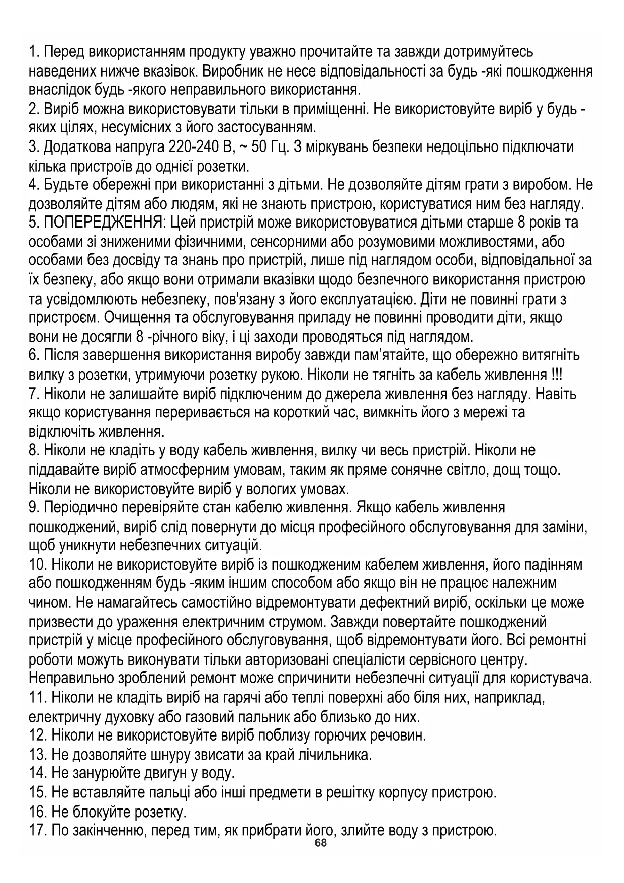 УМОВИ БЕЗПЕКИ. ВАЖЛИВІ ВКАЗІВКИ З БЕЗПЕКИ ВИКОРИСТАННЯ ПРОЧИТАЙТЕ УВАЖЛИВО І БЕРЕЖІТЬ ДЛЯ МАЙБУТНЬОЇ ДОВІДКИ Гарантійні умови відрізняються, якщо пристрій використовується в комерційних цілях.68