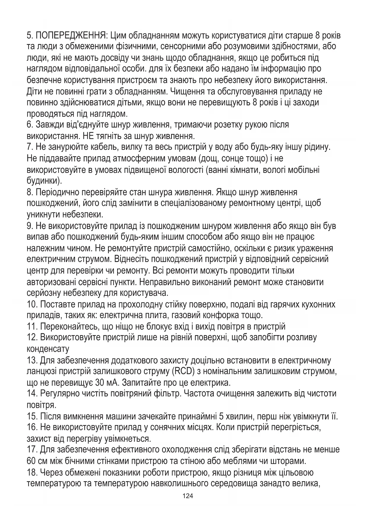 та люди з обмеженими фізичними, сенсорними або розумовими здібностями, або люди, які не мають досвіду чи знань щодо обладнання, якщо це робиться під наглядом відповідальної особи. для їх безпеки або надано їм інформацію про безпечне користування пристроєм та знають про небезпеку його використання. Діти не повинні грати з обладнанням. Чищення та обслуговування приладу не повинно здійснюватися дітьми, якщо вони не перевищують 8 років і ці заходи проводяться під наглядом.