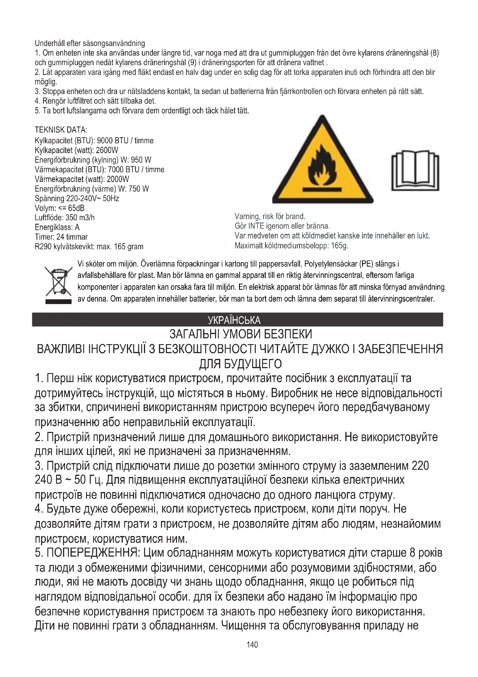 У інтересах навколишнього середовища. Будь ласка, віддайте картонну упаковку в місце збору мукулатури. Політиленові мішки (PE) викинути в смітник для пластику. Відпрацьований пристрій повинен бути відправлений у відповідну точку зберігання, тому що в пристрої є небезпечні інгредієнти, які можуть становити загрозу навколишньому середовищу. Електричний пристрій потрібно повернути так, щоб обмежити його повторне використання. Якщо у пристрої є батерейки, то потрібно їх витягнути і віддати до відповідного пунтку. Обережність, небезпека пожежі. НЕ проколюйте та не горіть. Майте на увазі, що холодоагент може не містити запаху. Максимальна кількість заряду холодоагенту: 165г.