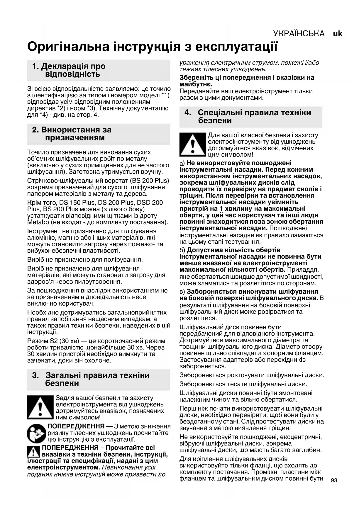 Оригінальна інструкція з експлуатації Зі всією відповідальністю заявляємо: це точило з ідентифікацією за типом і номером моделі *1) відповідає усім відповідним положенням директив *2) і норм *3). Технічну документацію для *4) - див. на стор. 4. Точило призначене для виконання сухих об’ємних шліфувальних робіт по металу (виключно у сухих приміщеннях для не частого шліфування). Заготовка утримується вручну. Стрічково-шліфувальний верстат (BS 200 Plus) зокрема призначений для сухого шліфування папером матеріалів з металу та дерева. Крім того, DS 150 Plus, DS 200 Plus, DSD 200 Plus, BS 200 Plus можна (з лівого боку) устаткувати відповідними щітками із дроту Metabo (не входять до комплекту постачання). Інструмент не призначено для шліфування алюмінію, магнію або інших матеріалів, які можуть становити загрозу через пожежо- та вибухонебезпечні властивості. Виріб не призначено для полірування. Виріб не призначено для шліфування матеріалів, які можуть становити загрозу для здоров’я через пилоутворення. За пошкодження внаслідок використанням не за призначенням відповідальність несе виключно користувач. Необхідно дотримуватись загальноприйнятих правил запобігання нещасним випадкам, а також правил техніки безпеки, наведених в цій інструкції. Режим S2 (30 хв)— це короткочасний режим